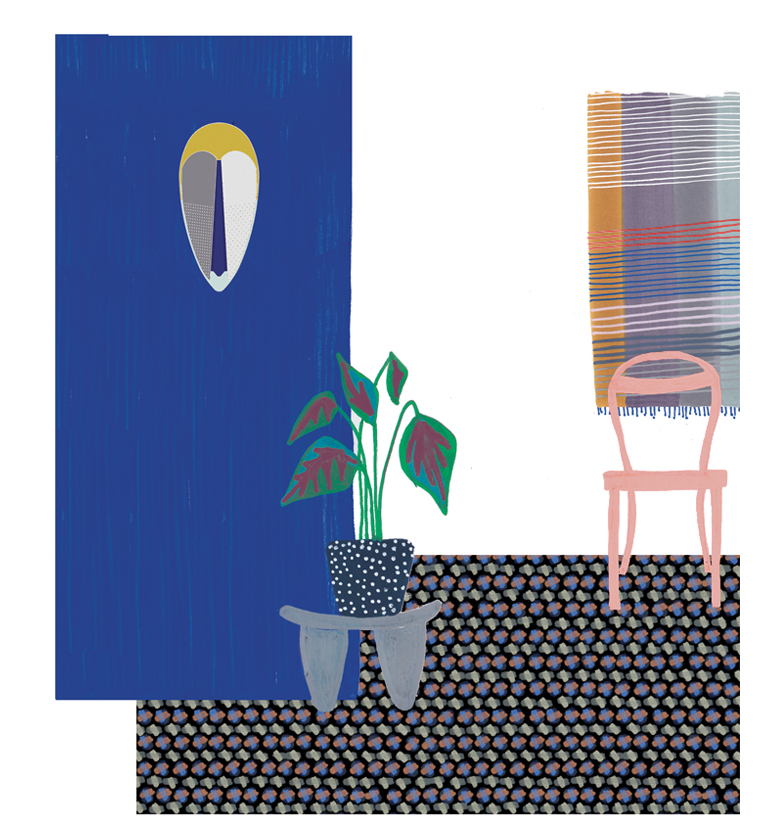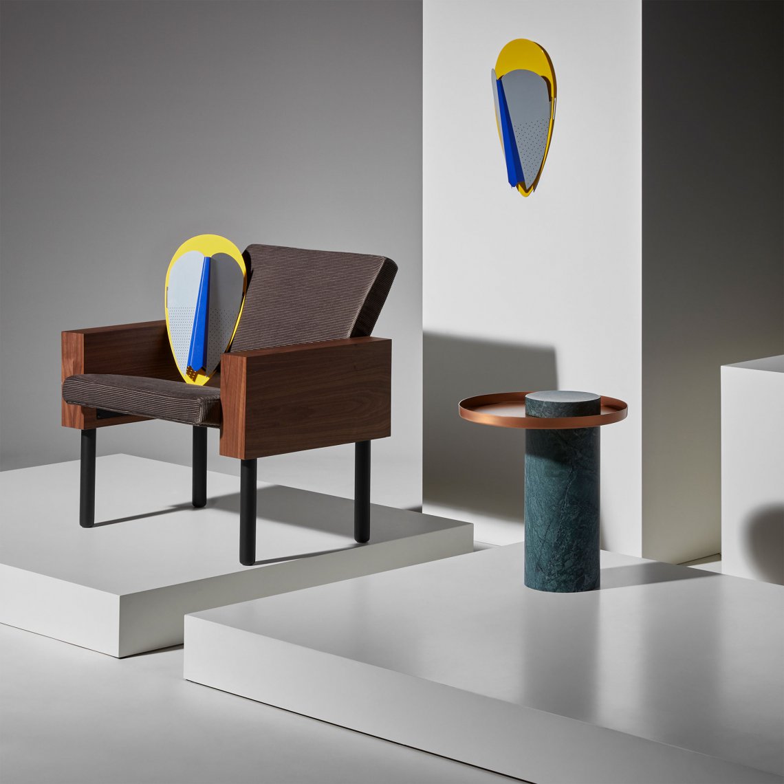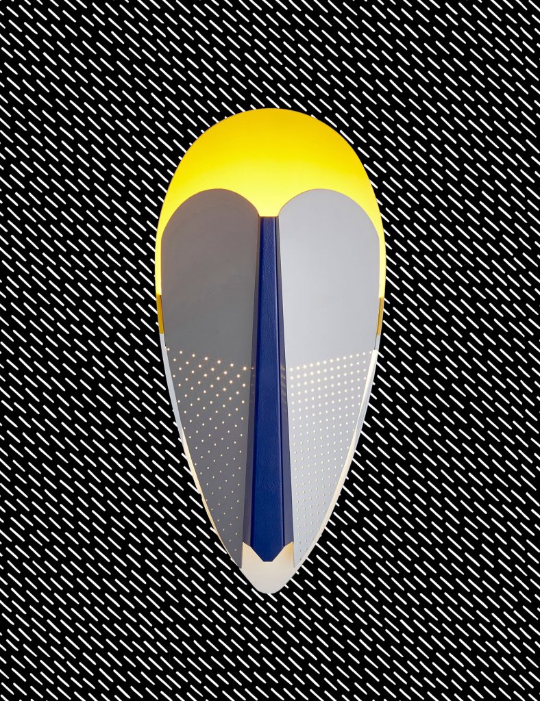 Sorcier is a wall light inspired by the ritual Ngil masks of the Fang tribe in Gabon. The light diffuses through the perforations in the mask and shines upward in a graphic and gentle way. It changes personality depending on the combination of colors, textures and perforated patterns, which vary in each version.