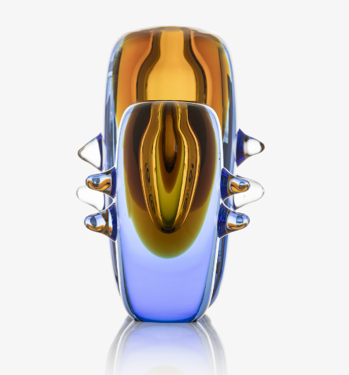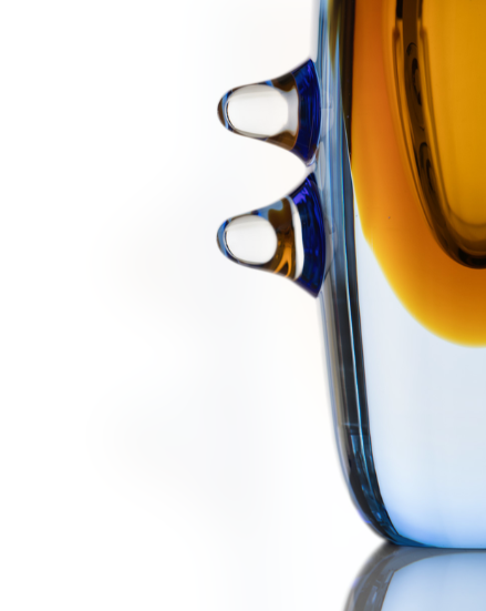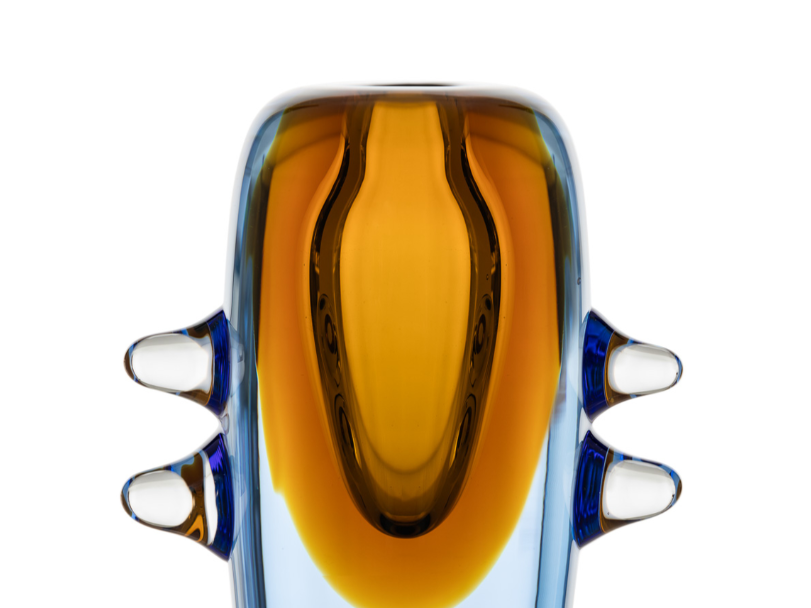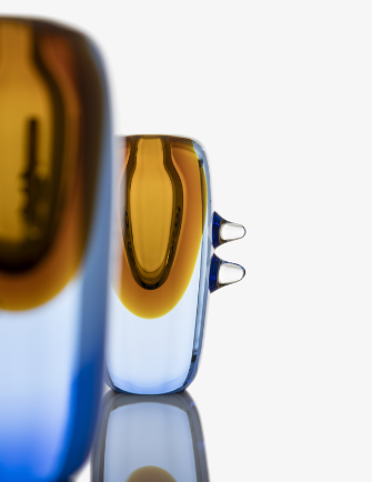 The vases received the name Papilla due to their round protrusions which are reminiscent of nipples, or papillae in Latin. Each vase is made from a combination of crystal and stained golden-brown glass which is then glazed with a pastel-blue finish. Achieving the desired shade of blue is not at all easy, as each gram of the added material can change the final outcom.