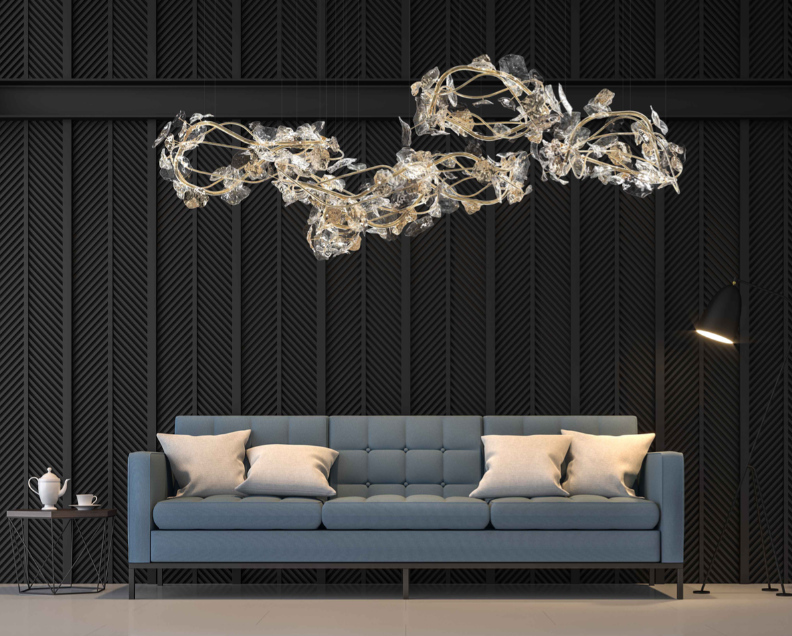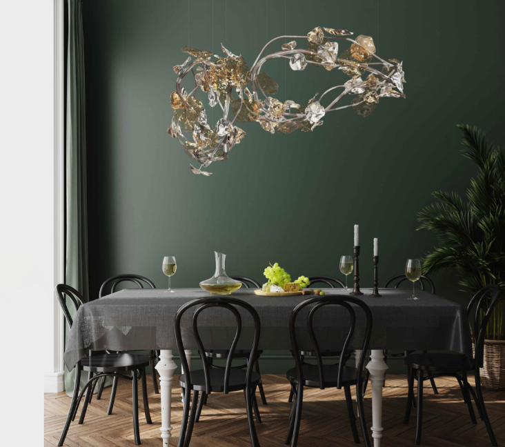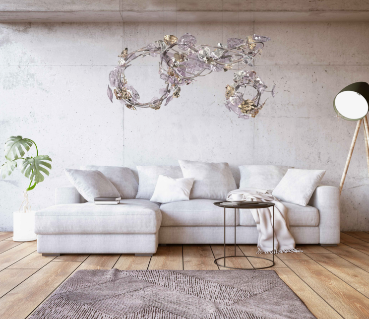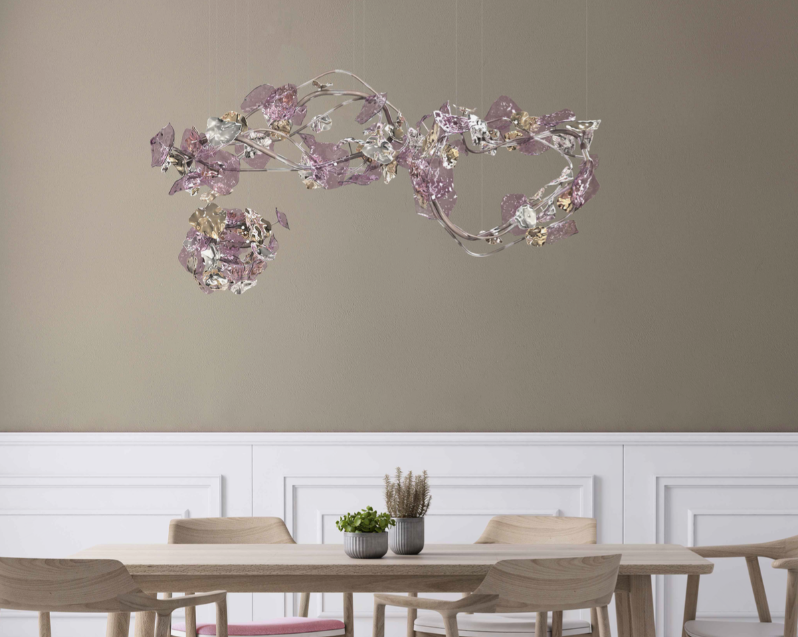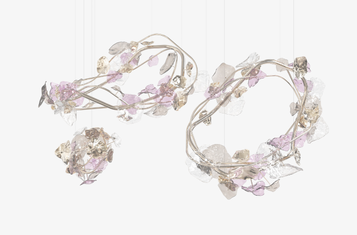 Like a summer afternoon, this wreath buzzes with myriad shapes and colors. We wanted to capture the heat of the summer night in glass, and this design aims to become a hanging charm to celebrate light, blooming, and the creative side of nature. Midsummer contains three different modules, or "rings." It is possible to purchase module A, B, or C separately or combine them. There are also color varieties, a combination of rose, silver metal-coated, and gold metal-coated components for a warm-colored design or a combination of clear with bubbles and smoke pieces for a cool color scheme.