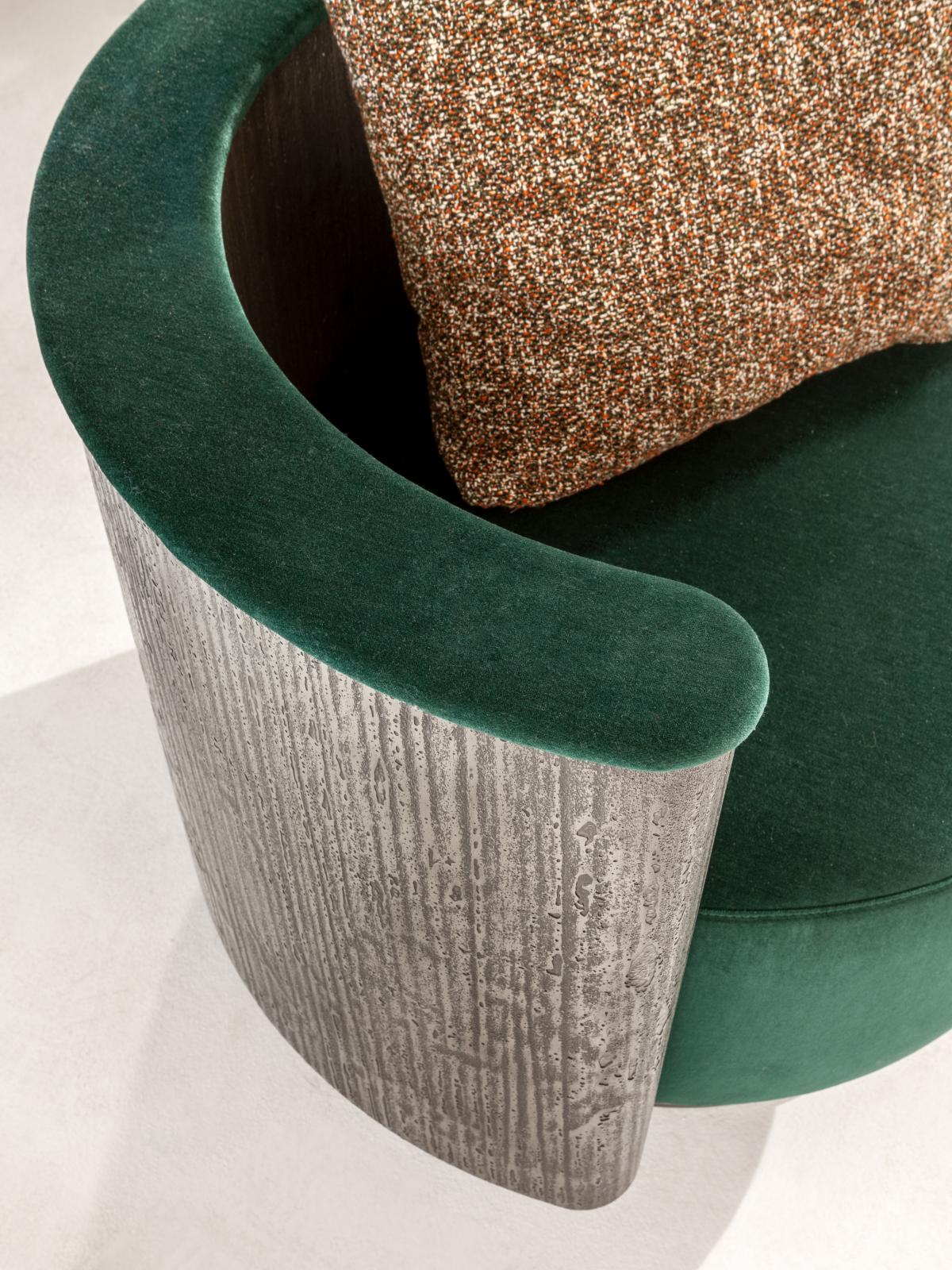 Swivel armchair with rounded shell in plain wood, lacquered wood or in special finishes. Also available in Liquid Metal.