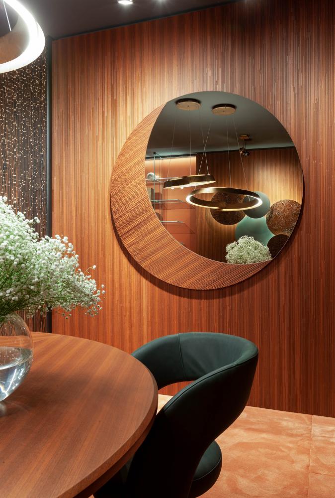 Round mirror with wooden frame and frontal panel decorated with Decor carving on the sight side. It is available in all woods of the collection, with a Liquid Metal finish and in special dimensions.