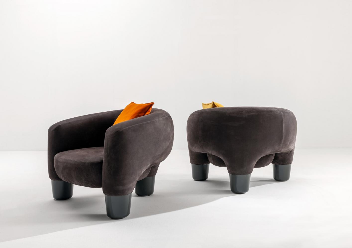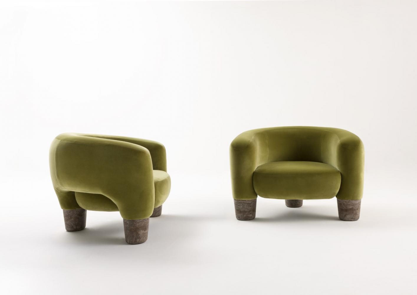 The Rialto armchairs stand out for their soft curves and imposing dimensions. A further highly characterizing design element is the presence of three sturdy marble legs, which give originality and rigor.