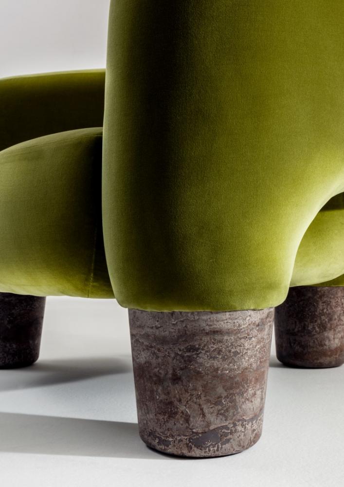 Padded armchairs covered in leather, velvet or fabric, and characterized by three sturdy marble legs.