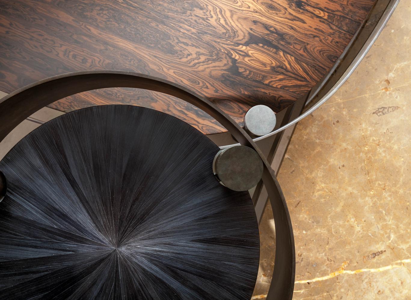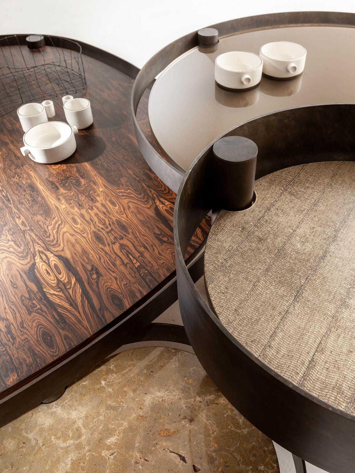 Set of modular coffee tables with tubular base in etched metal with "tray effect" and top in wood, marble, stone or crystal, available in various sizes and heights.