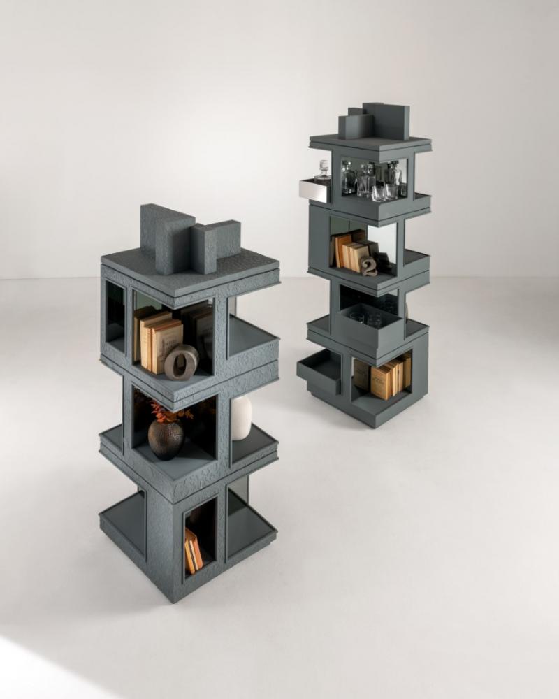 Column made of wood or with a concrete-effect finish, which accommodates a series of removable trays in polished steel, or in concrete-effect, in several compartments made in different sizes.