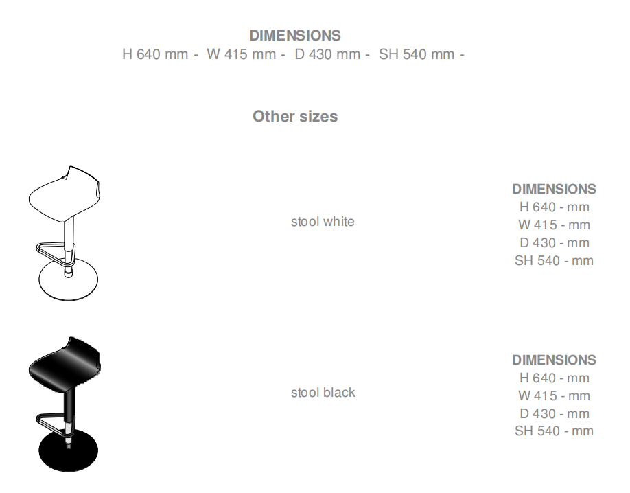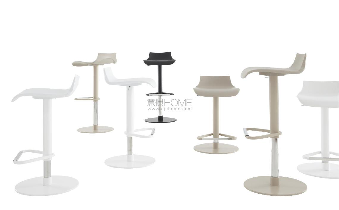 Piston-operated stool with a rigid polyurethane shell which is moulded then lacquered. Structure finished in a matching shade of satin-finish lacquer.