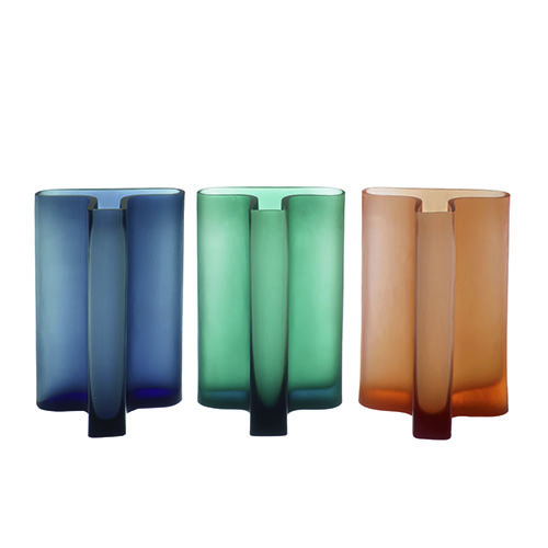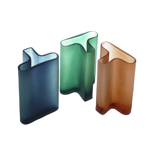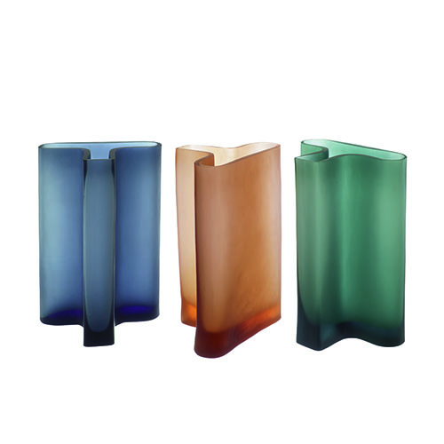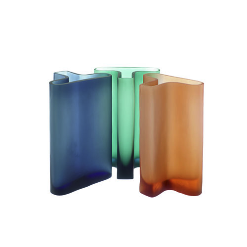 T花瓶是玻璃吹制后磨砂處理的高級(jí)手工藝作品。T花瓶的任意一邊可以用來(lái)握持花瓶,而全部三邊則可以用來(lái)支 撐和分散擺放花莖或花枝。這些花瓶可以放在一起,組成一個(gè)緊湊的組合,由于T花瓶提供3種柔和和諧的顏色, 易于組合,因此使得使用體驗(yàn)更加有趣。 制作T花瓶需要兩年的工作,主要是因?yàn)橹谱鬟^(guò)程復(fù)雜:需要一邊旋轉(zhuǎn)模具一邊將玻璃吹到平臺(tái)上。該技術(shù)需要很 高的靈活性,必須非??焖俚赝瓿刹僮?。零件冷卻后,需要手動(dòng)刮擦以獲得朦朧的外觀。 靛藍(lán),桃紅和灰藍(lán)三種顏色可供選擇,每件都很獨(dú)特。所有的花瓶都由制作者簽名。