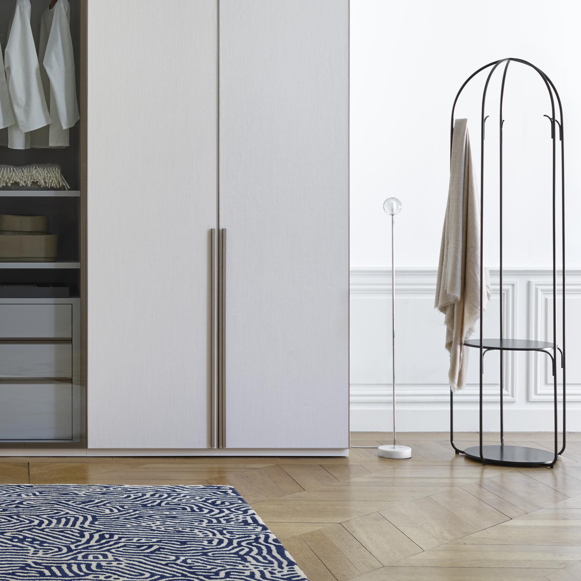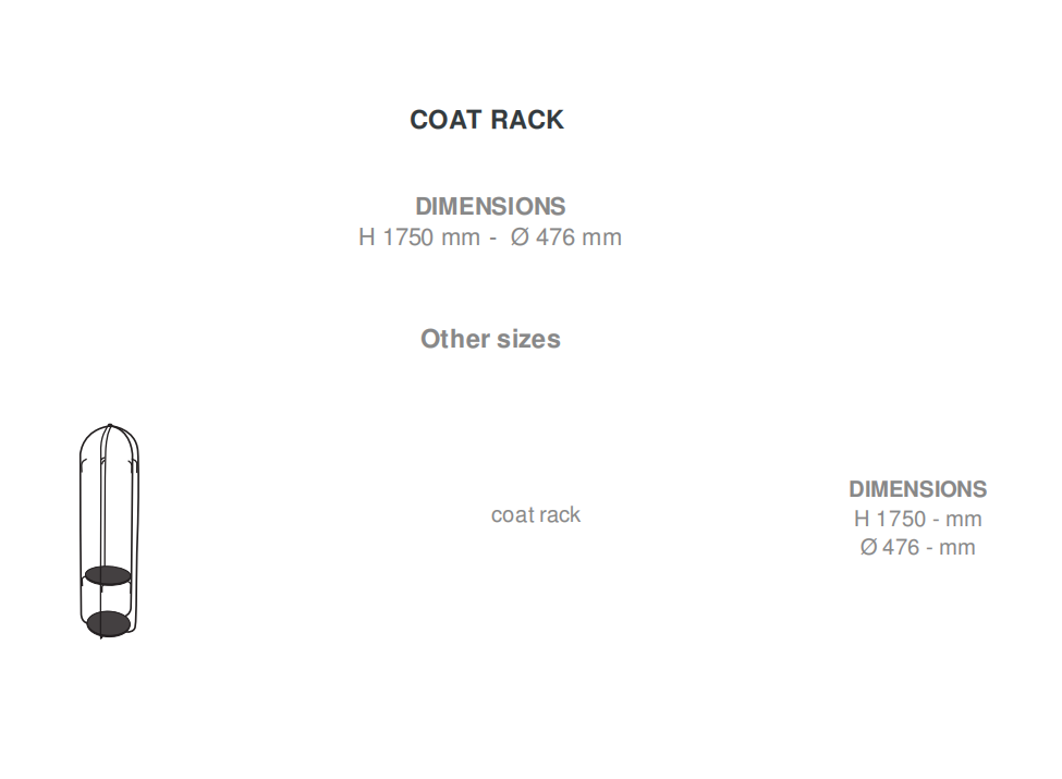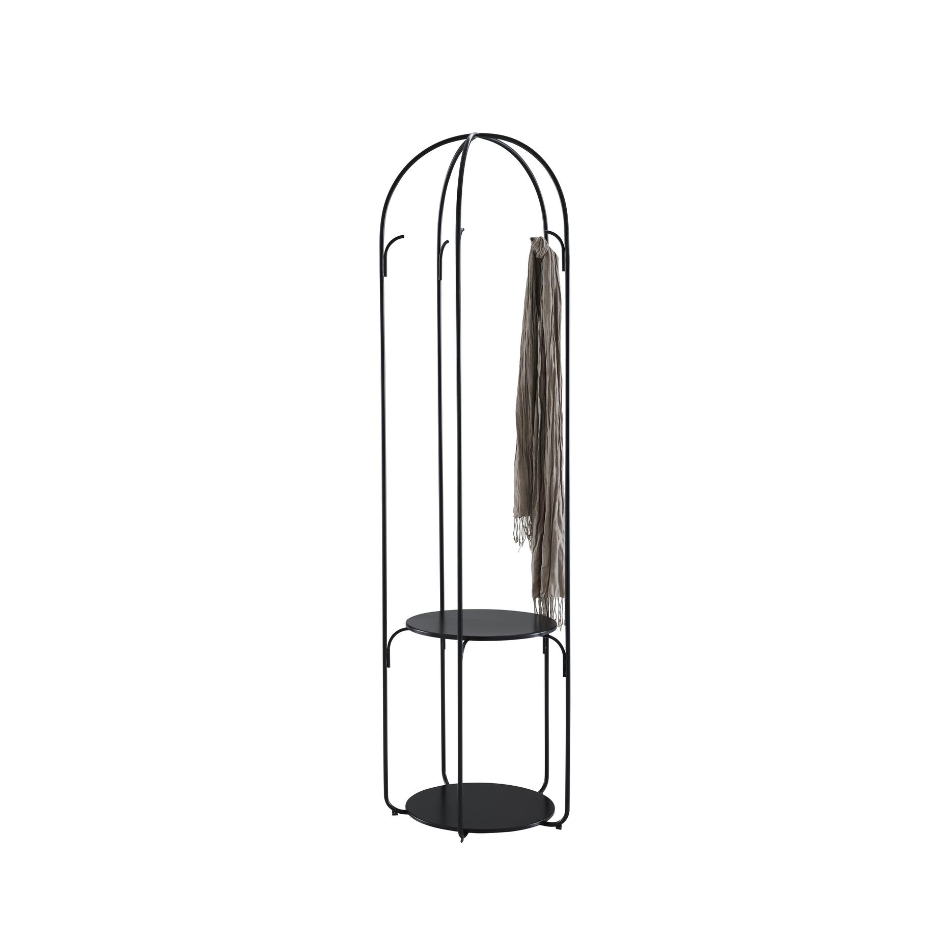 Gabbia is Italian for 'cage'. How does one design a shape which is attractive outside its function as a coat rack? To find this aesthetic autonomy which is independent of its function, it was necessary to design a rack almost like a sculpture, with a shape which makes it exist within its space. In the case of Gabbia, the process was inverted: the object must remain readable, presence of clothes notwithstanding. Functioning just as well as container as a rack, the structure of the coat rack is not concealed by the clothes since they are hooked inside it. Coat rack in satin black lacquered steel with 2 black lacquered steel surfaces (? 38.7 cm).
