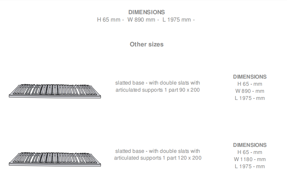 Frame in solid beech and sanded un-varnished plywood (anti allergenic and environmentally friendly). Double slats are in carbon-coloured beech multi-ply and are mounted onto flexible articulated supports that are very durable. For better support, the centre portion has slats that are linked to each other by rubber webbing. At shoulder level, support fixings have a variable depth support system: This helps the blood circulation, and helps avoid shoulder and neck tension, which is particularly important for those who sleep on their sides. Each slat in the central zone (back and pelvis) is reinforced by a second slat. In this case the lower slats are equipped with two runners which allow individual setting for softness/firmness, whilst the top slats retain their individual suppleness. The overall height has been reduced as far as possible (6,5cm) to ensure the best fit across almost all types of bed. Motorised slatted bases are equipped with two motors and offer motorised adjustment on the back and leg sections (head section manually adjustable). Circuit breaker, emergency lowering in case of power outage