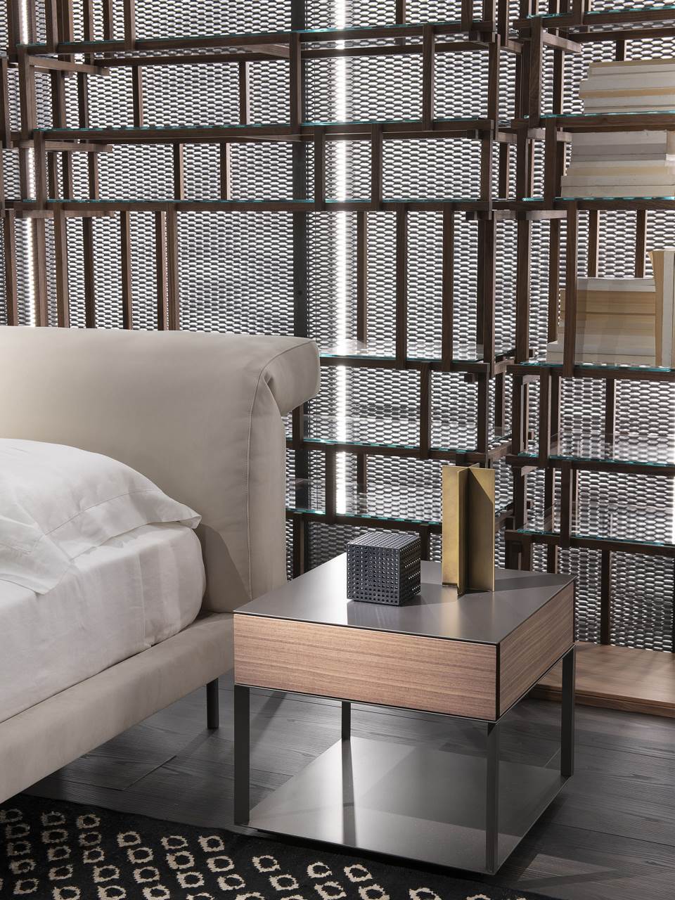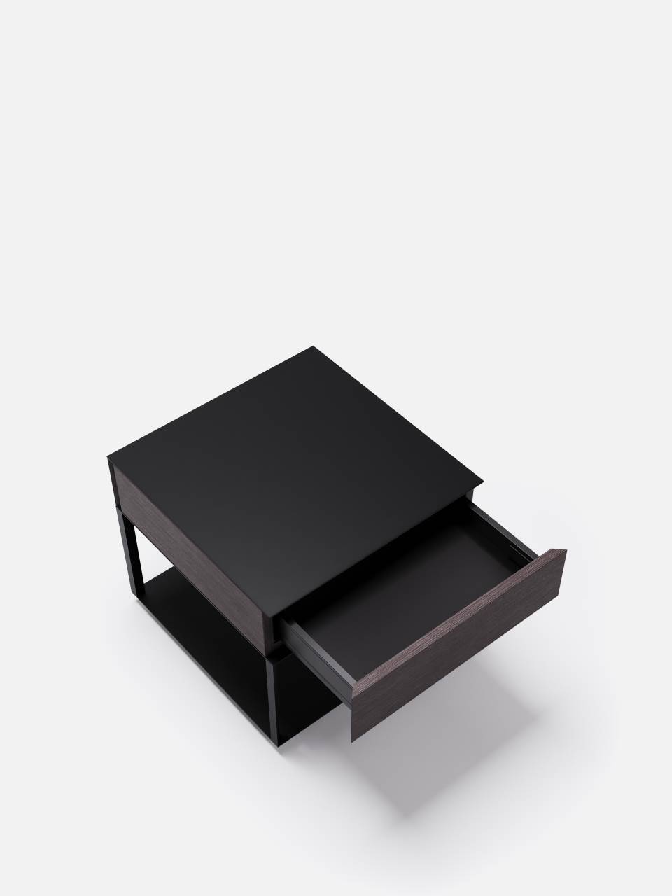A square base creates a structure that intersperses a landscape of solids and voids, culminating in a practical shelf together with intimate and discreet drawers, disguised by the outer surface.