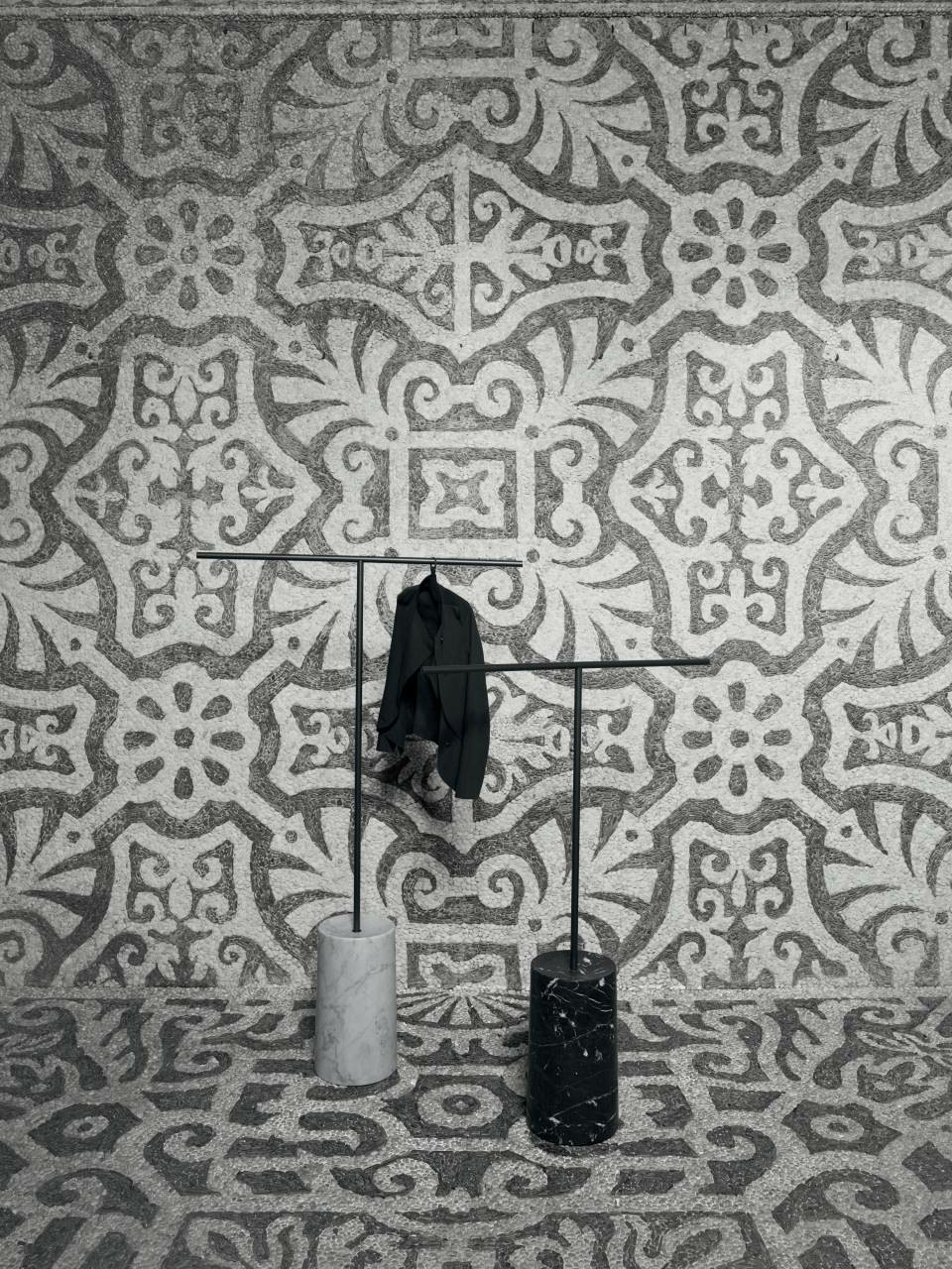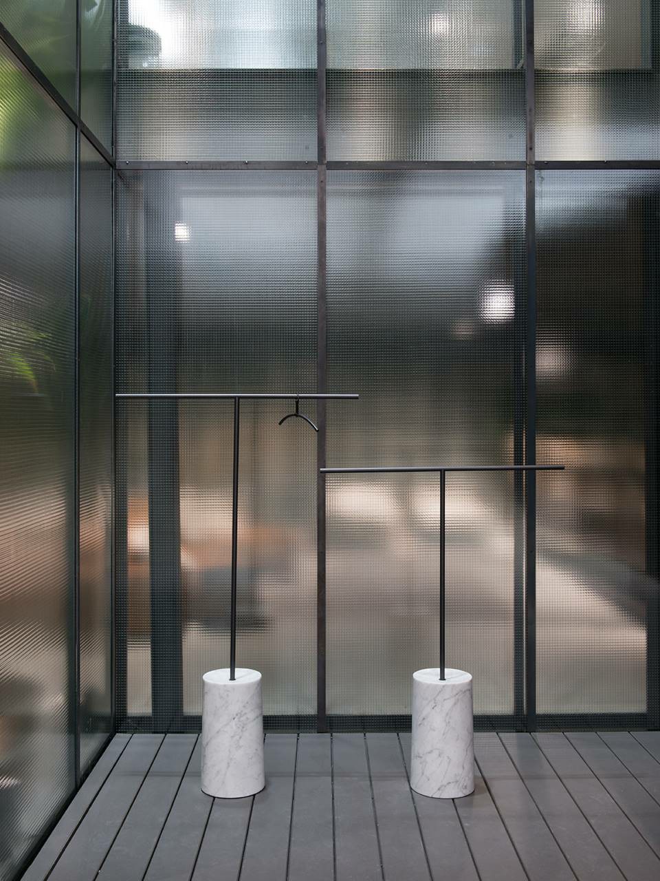 Coat-hanger, available in two heights, composed of a base carved from a single block of black Marquina, white Carrara, red Levanto marble with satin finish and opaque transparent protective varnish; or in high-strength concrete finished with a hydro-repellent protective treatment, with embedded a steel insert. On request, the marble base is available also with polyester glossy finish. Frame composed of two tubular steel ?20 mm elements, joined together by means of screw, lacquered with epoxy powder coating gunmetal grey colour, fixed to the base by a pierced sheet. Hangers consisting of a ?12 mm calendered steel rod and ?35 mm steel ring lacquered with epoxy powder coating gunmetal grey colour, connected together by a “band” of sewn black leather.