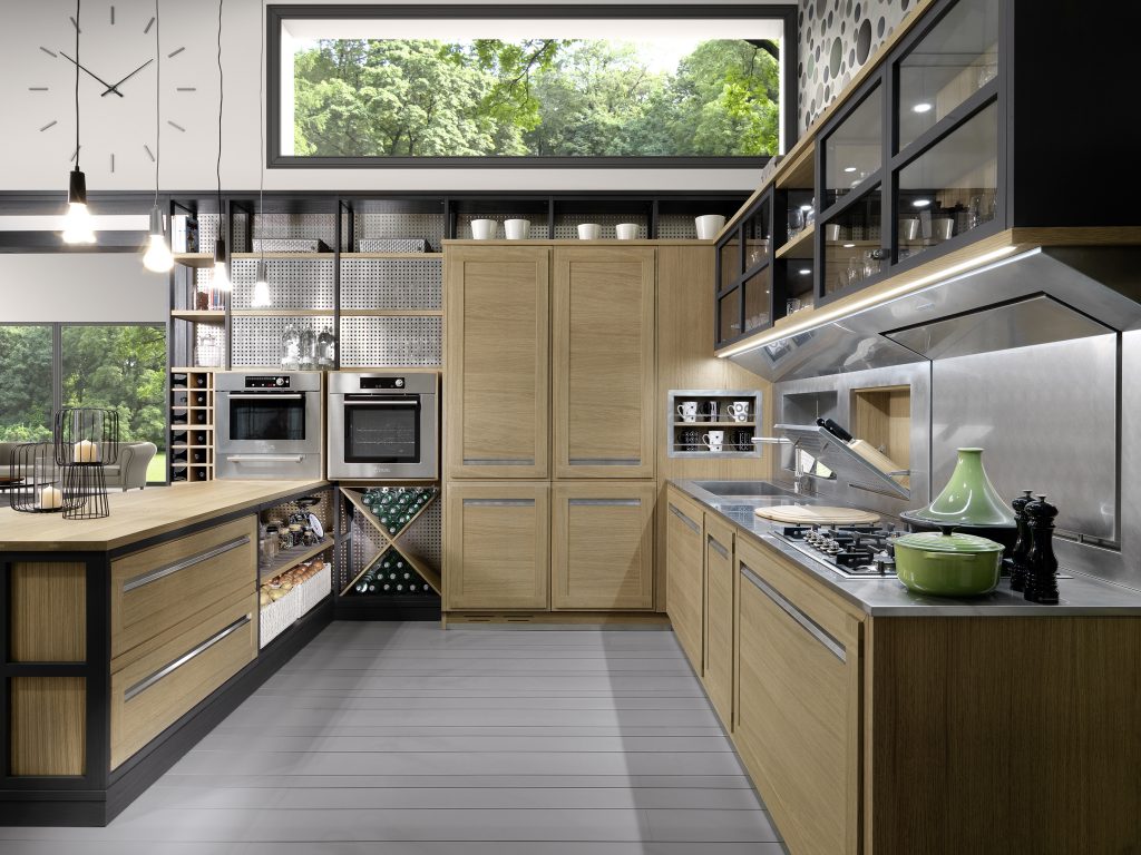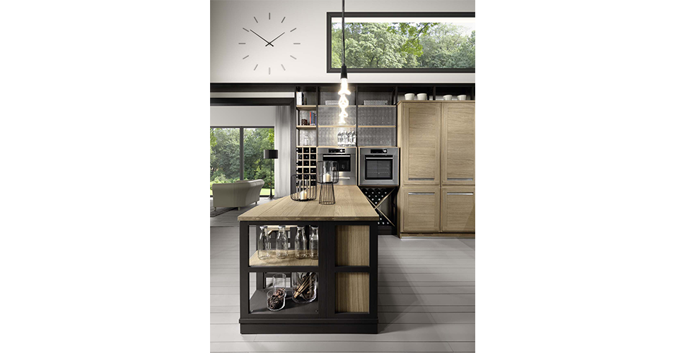 The steel details of plinth or of the integrated handle recall a contemporary warm atmosphere which could be completed thanks to Calendario system and its open compartments.