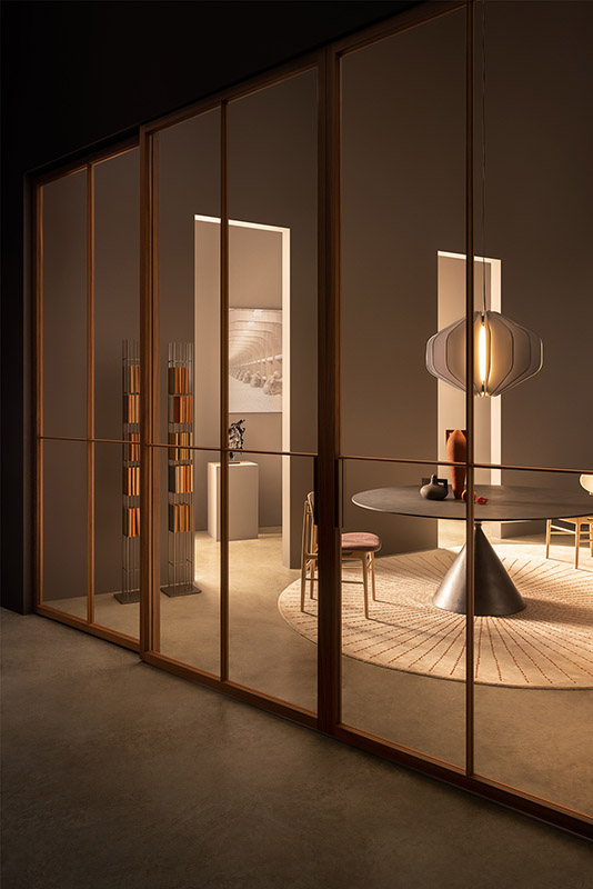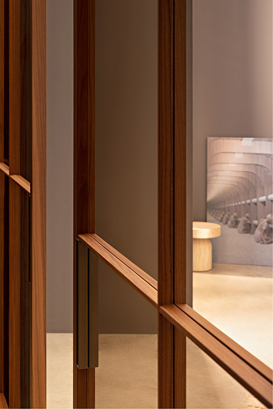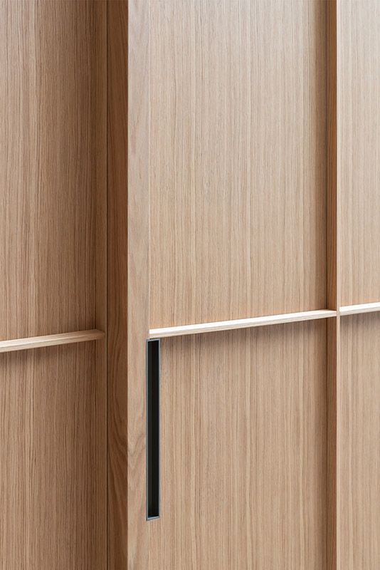 La porta per interni esterno muro Drive è un sistema combinato di porta scorrevole e di binario telescopico predisposto per essere installato direttamente a parete. Può leggersi come una superficie appoggiata alla parete.
