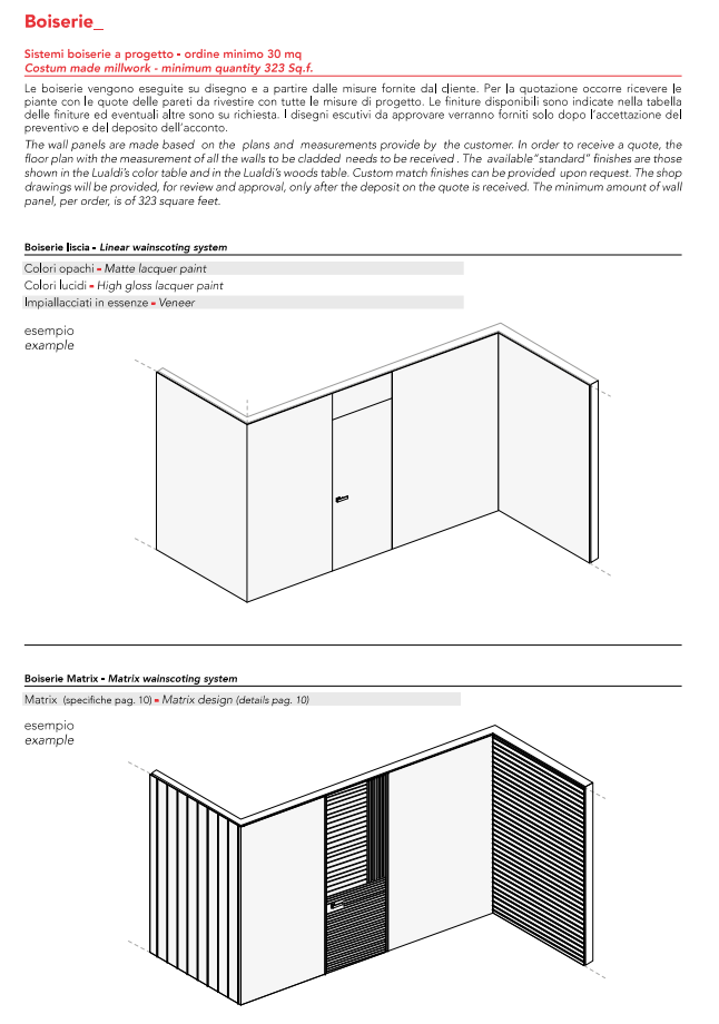 Edge boiserie is made using shaped panels, one side only. Finishes: matte lacquer paint. Dimensions: width from 600 mm up to 1200 mm; height max 3000 mm.