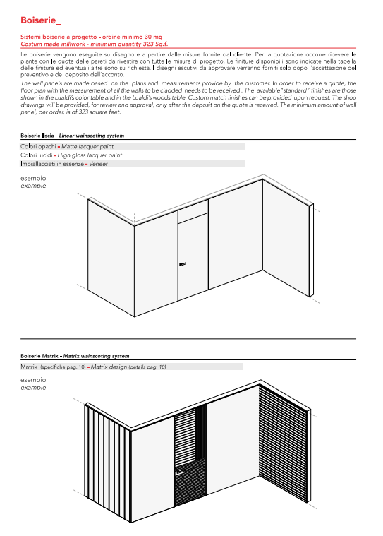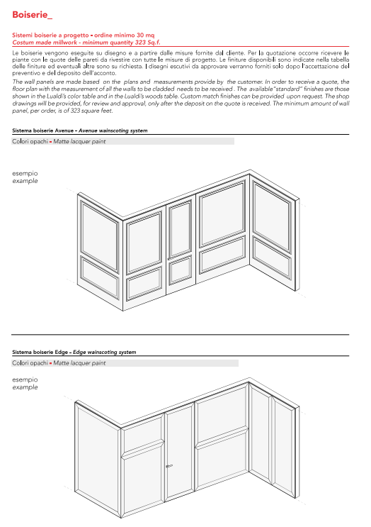 Le boiserie vengono eseguite su disegno utilizzando pannelli nelle finiture laccato opaco, laccato lucido e essenze.