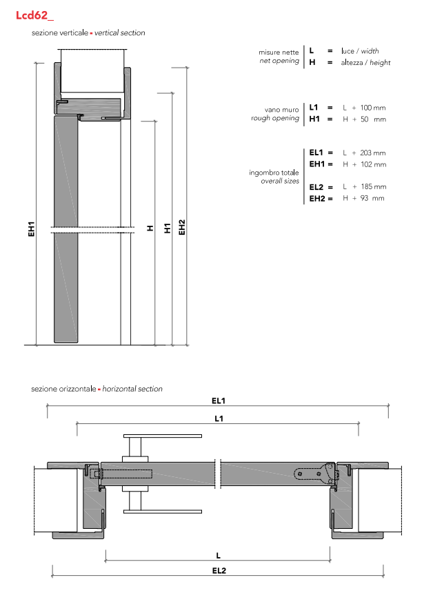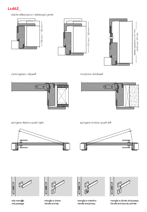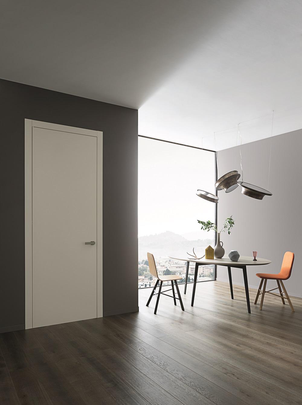 Swing wood door 41 mm thickness. Magnetic lockset, concealed hinges and anti-noise gasket included. Wood jamb. Trim 12 mm thick, flush with the door on the pull side. Telescopic wood trim for wall thickness from 105 mm to 130 mm; available for max wall thickness 500 mm. Reversibile opening. Mounted on traditional wood subframe.