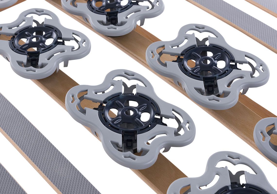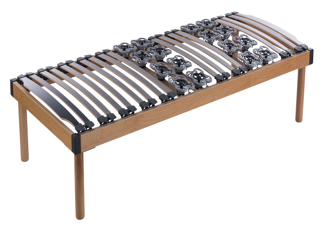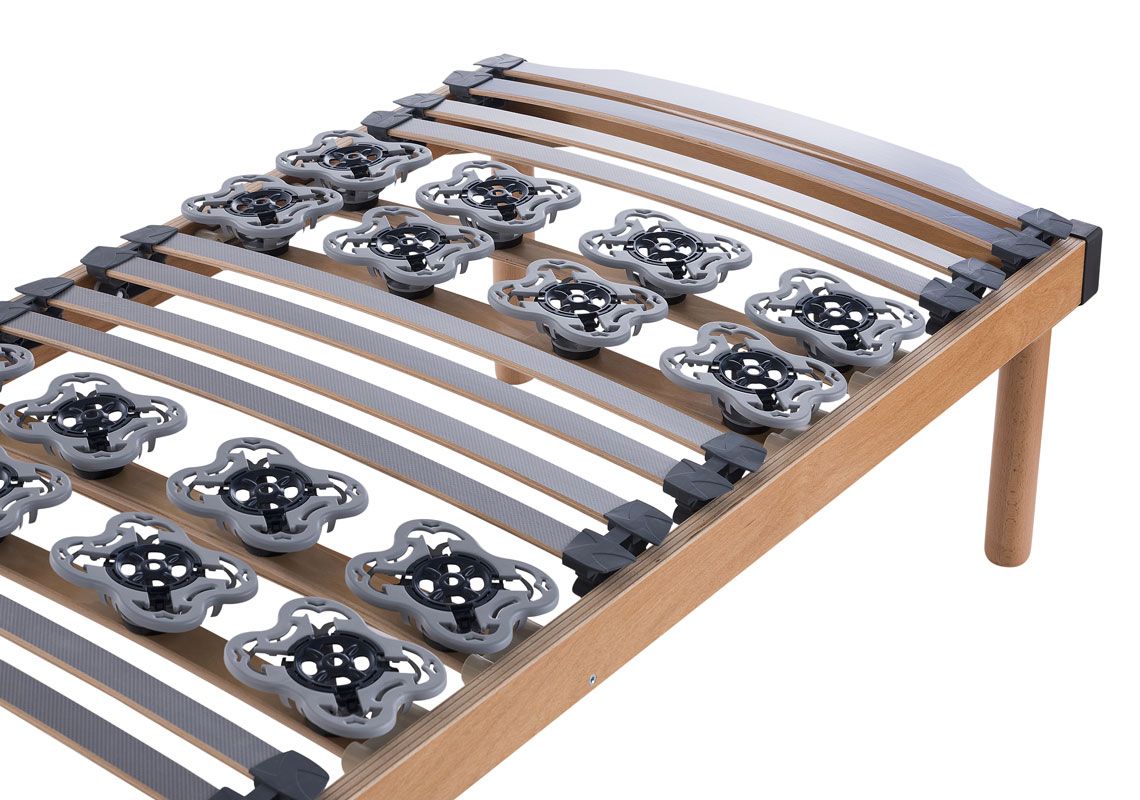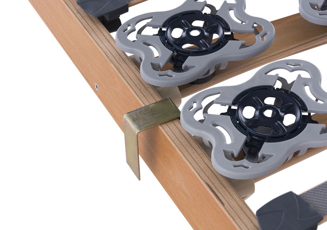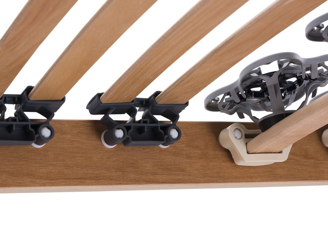 The ergonomic plates with shock absorbers in the dorsal and lumbar area allow you to adjust the firmness of the adjustable base to suit your individual needs based on your body weight. The adjustable base also has 26 beech slats with rubber shock absorbers to ensure optimum support of the body. The adjustable base for king-sized beds is available in two versions: with single supporting frame or with two single supporting frames.