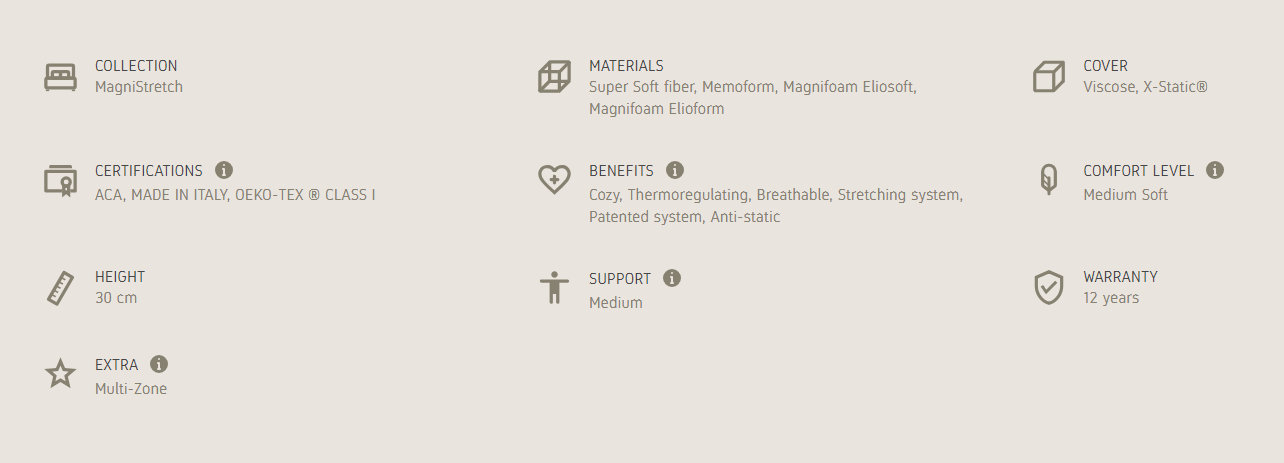 The technological and innovative mattress that guarantees outstanding benefits for your spine, thanks to the stretching and decompressing action while you sleep.A mattress that is comfortable, breathable, anti-static and that regulates the temperature, providing a medium support in 30 cm of height.