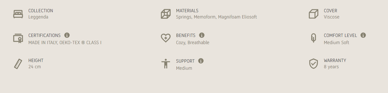 Sonno Memo Spring, thanks to the breathable properties of viscose, keeps the body cool all night. The packed springs coupled with Memoform, support the body’s weight in different ways.