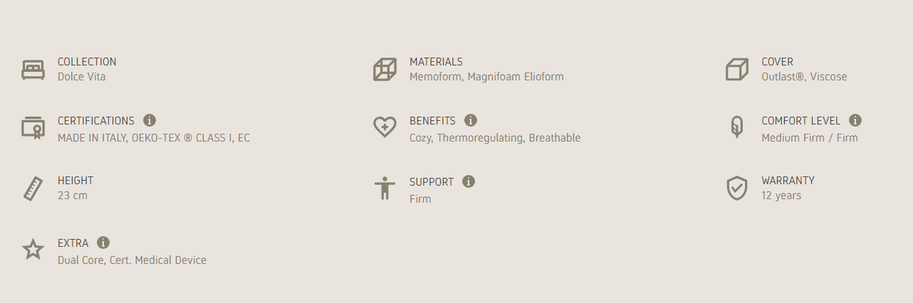 Comfort Deluxe Dual 9 Firm of the Dolce Vita line is inspired by the excellence of Made in Italy and Italian lifestyle. The combination of materials like Memoform and Elioform, along with the refined cover in Viscose and the innovative Outlast? fabric, provide a firm support at 23 cm of height. The Dual Core technology ensures the perfect comfort for couples with different comfort preferences.