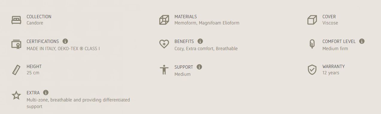 Candore 10 of the Candore line puts personal well-being in the first place and combines perfect hygiene with the perfect support. Designed to provide a Medium Firm comfort. All at 25 cm of height.