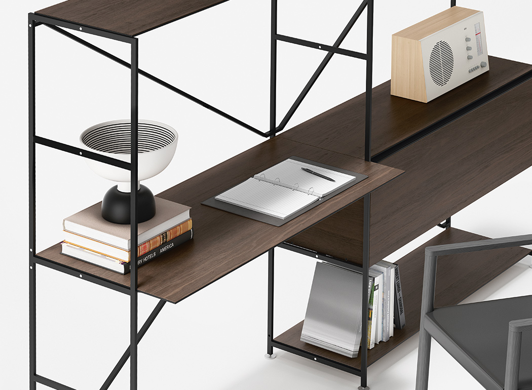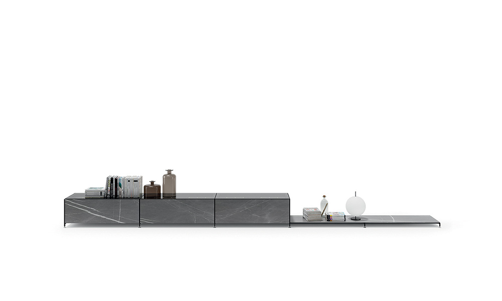 The modular R.I.G. shelving system is able to transform into any number of low profile furniture solutions suitable for the living room, study, entrance hall and dining room, including television stands, small tables for lighting, credenzas and low height bookcases. To simplify: uniqueness vs. coordinated. A methodized precise concept, modelled on basic needs and the environment. R.I.G. is a system and, as such, it is both starting and landing point. In the middle of the process, choices are dictated by creativity, taste and needs. In the living area, R.I.G. can be arranged into bookcases, tabletops, low furniture for audio and video systems. It can decorate the walls or left freestanding in a room. Combines smart quality of modularity with the aesthetic value of each independent elements, because of the unique structural lightness and materials that furnish the accessories: shelves in different depths and contained modules.