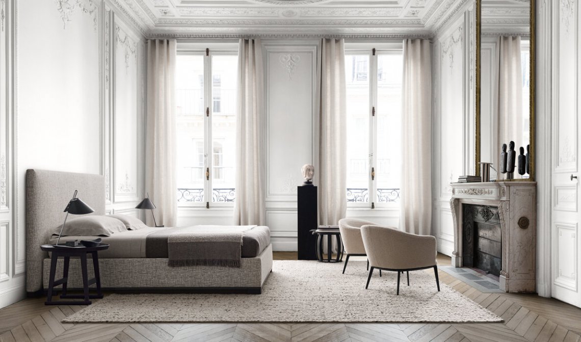 The Bauci bed is provided with a slatted base that can be lifted and has a practical compartment below. The lower edge is in painted steel. A precious detail is given by the peripheral base of solid wood which can be chosen between different colours. The bed can be combined with all the headboard included in the collection.