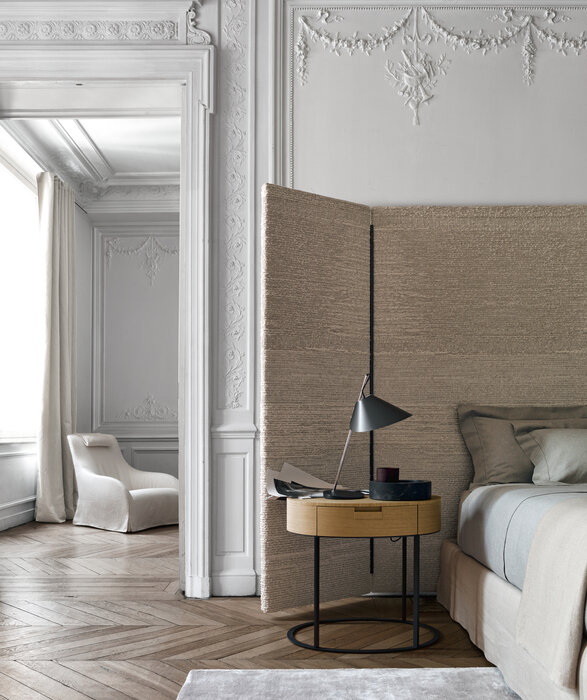The headboard Dike with unusually-size, is a distinctive element that creates a new furniture category. Antonio Citterio imagined two panels, ending with two mobile elements, anchored by an elegant full-height hinge. This headboard becomes a theatrical backdrop or a structural element which is made even more sophisticated by the upholstery. Dike uses an ad-hoc designed fabric, with an enhanced three-dimensional and visible texture similar to a woven horizontal band tapestry making light and colour visual effects which fade gently into each other. This is a new and luxurious and refined range, hyperbolic but extremely calibrated, soft, and rational, which underlines Maxalto’s renewed desire for excellence and originality.
