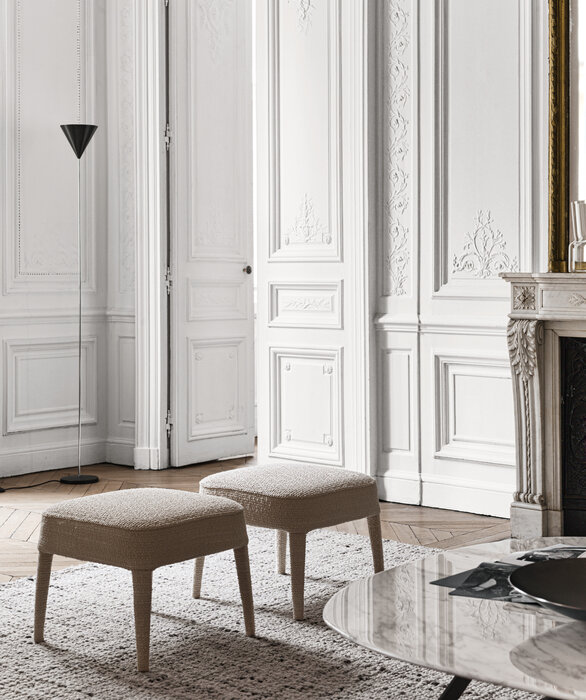 Febo is a family of seats that carries with it the memory of a traditional design distinguished by a large enveloping back without armrests. The sofas, available as two-seater or three-seater, come in two sizes: a smaller one with low or high seat cushion and a larger one. The upholstery is in fabric or leather with visible blanket stitching. The base-frame and legs are in solid wood and are also available in a single-material version, covered in fabric or leather like the cushions.