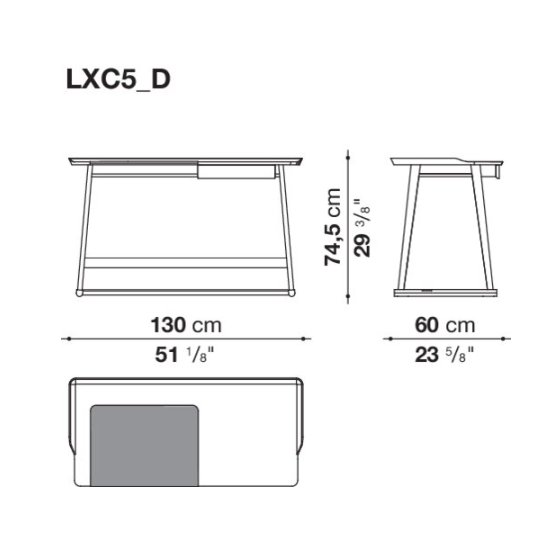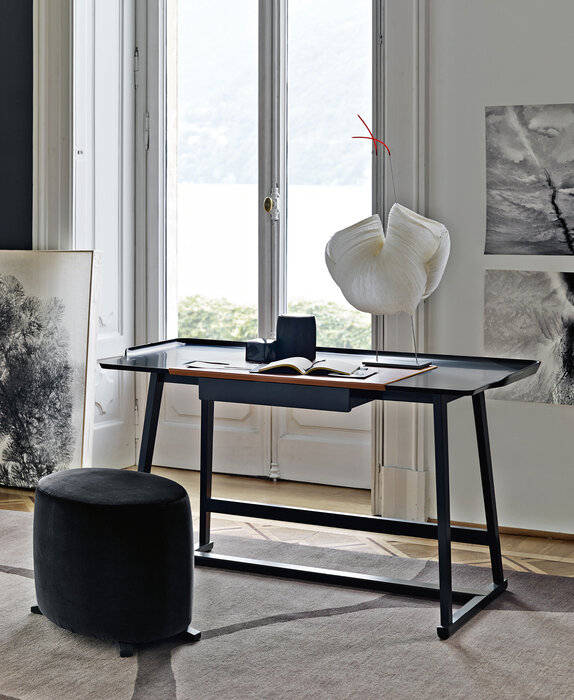 The Recipio ‘14 writing desk with drawer is characterised by a tripod frame in solid wood and by a Baydur? structural polyurethane foam top marked by soft lines and a tray-shaped design. Particularly sophisticated is the shellac effect finish in a variety of colours. The top is completed by a removable, small, leather-covered top, a functional element that contributes to the desk’s refined aesthetics.