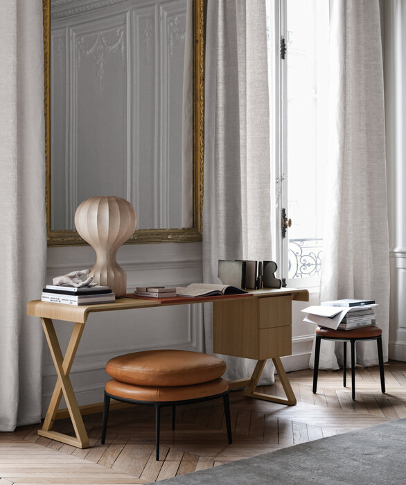 Sidus is a precious writing desk with rectangular top in curved wood or with an or with an unusual “bean” shape. Equipped with practical drawers, it is available in different sizes and finishes, also in the version with cable glands for functional and refined home office stations.