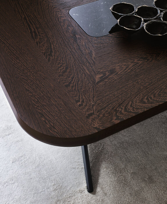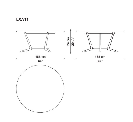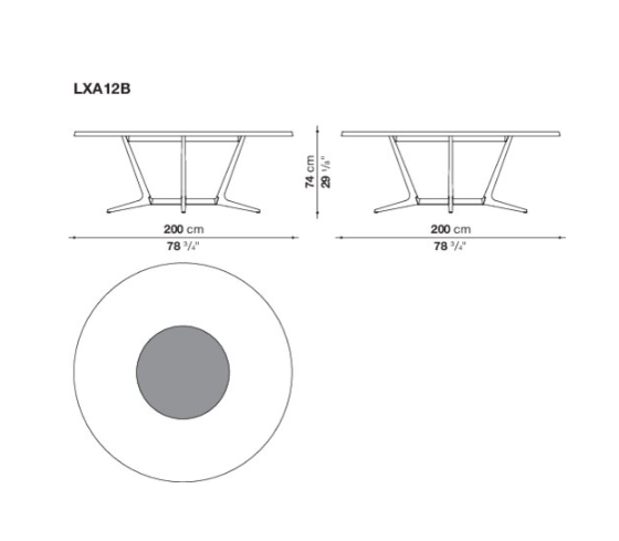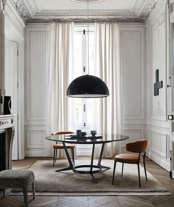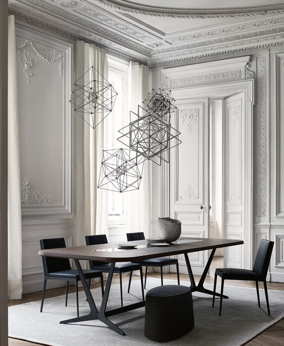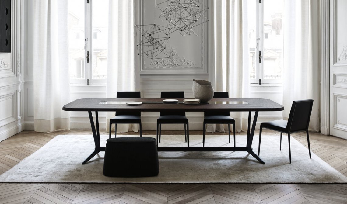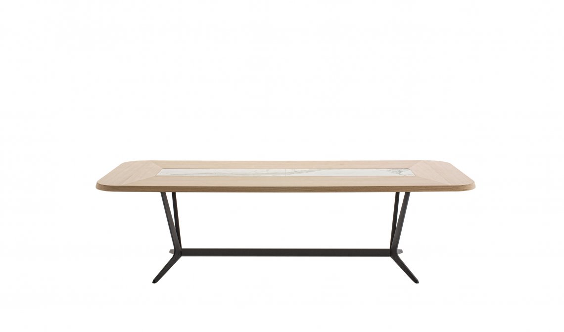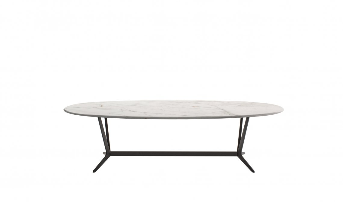 Astrum is a collection of tables, rectangular, round and oval, distinguished by the special “sawhorse” base-frame. The frame is made of a single die-cast aluminium support with painted finish that, based on the table shape, is composed of two or three elements connected by a crosspiece and forming the base-frame for rectangular tables, while three elements connected at the base of a steel ring establish the support for round tables. The triangular section of the support, raised from the ground with a slight tilt, gives the structure both lightness and solidity. The tables tops are provided in various finishes of wood, lacquered and marble. Only with the round versions it is possible to insert a swivel tray.