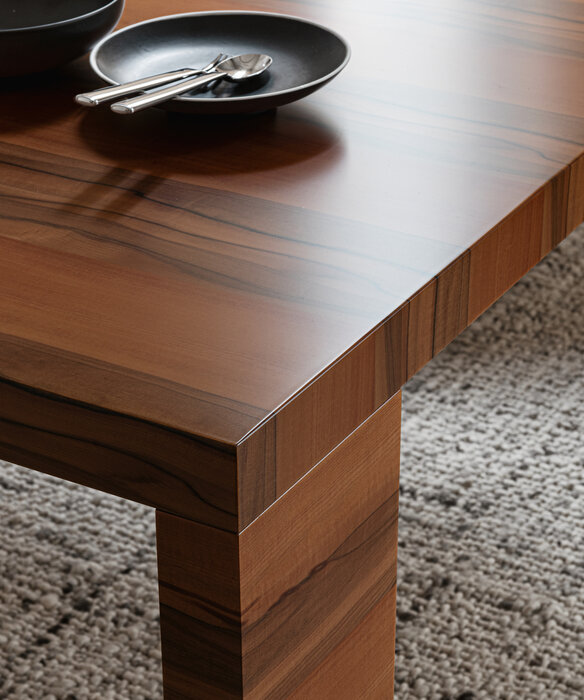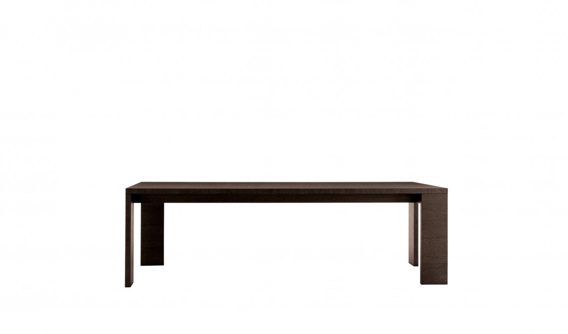 A striking table, with an essential design underscored by thick profiles and asymmetrical legs, making it a piece of furniture that dominates any room. Available in square and rectangular sizes, the table now comes in a semigloss Chilean tineo wood version, a precise stylistic feature also found in other pieces in the collection, as well as in more classical natural wenge or brushed light, brushed black and grey oak. The special folding technique used to create it highlights the table’s refined workmanship, creating perfect continuity between the surface and the edges of the top.