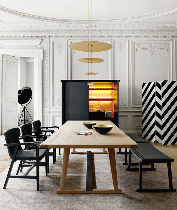 A contemporary reinterpretation of the classic refectory table, Recipio ‘14 is a rectangular wooden dining table. The top stands out for its slatted motif, while the crosspiece placed at the base is covered with a steel profile having a dual, aesthetic and protective function. The Recipio series also includes small tables, consoles and a writing desks.