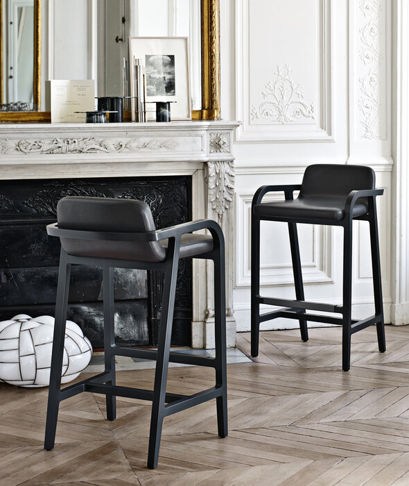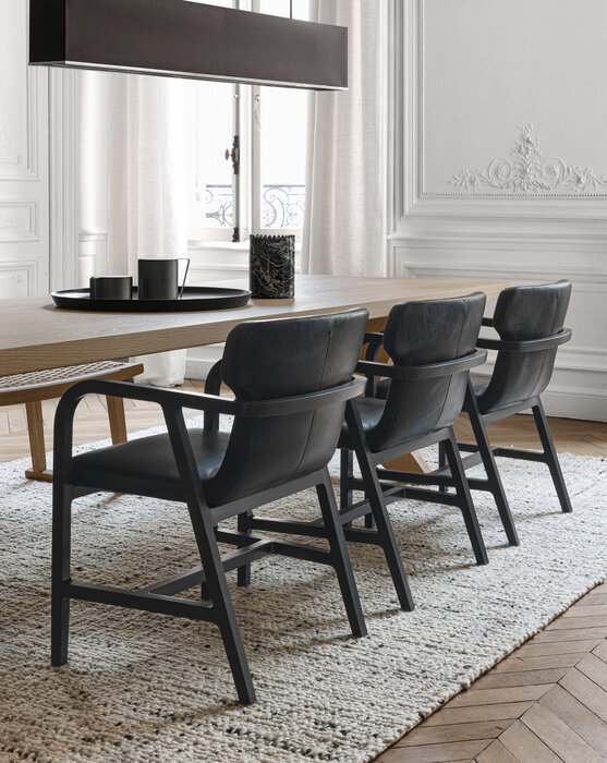 Chair with armrests that shares with the small armchair the finishes and the handcrafted excellence. Stylistically, the piece evokes classic thonet pieces without oriental overtones, confirmed by the silky hand of the wood. The seat-back shell, externally shellac lacquered, is internally upholstered and covered in leather or fabric.