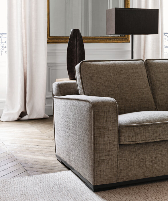 In the name of comfort, the Imprimatur linear sofa offers a formal interpretation, develops the two lengths with a regular partition of the seat and back cushions. An armchair is provided to complete the Imprimatur series. The whole series has a precious profile om the cover and a lower edge in painted steel.