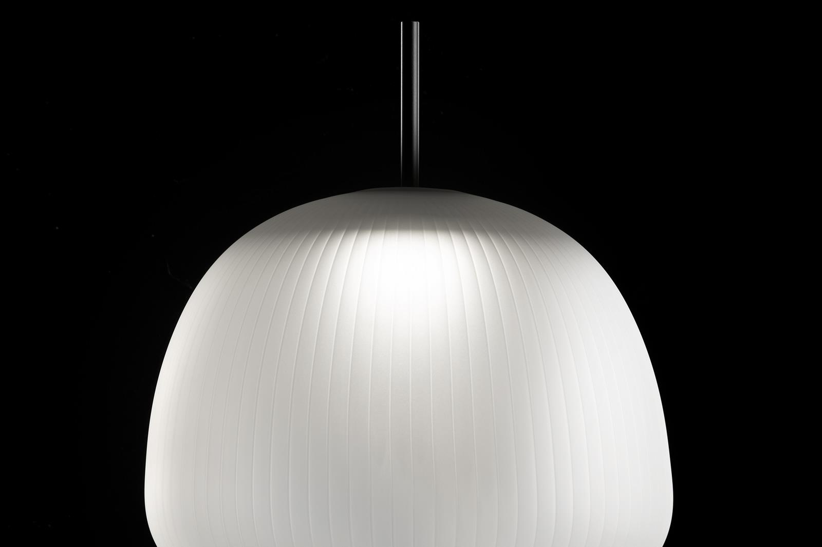 Suspension lamp. Hand blown titanium metallized glass dome with internal frosted bubble glass sculpture.