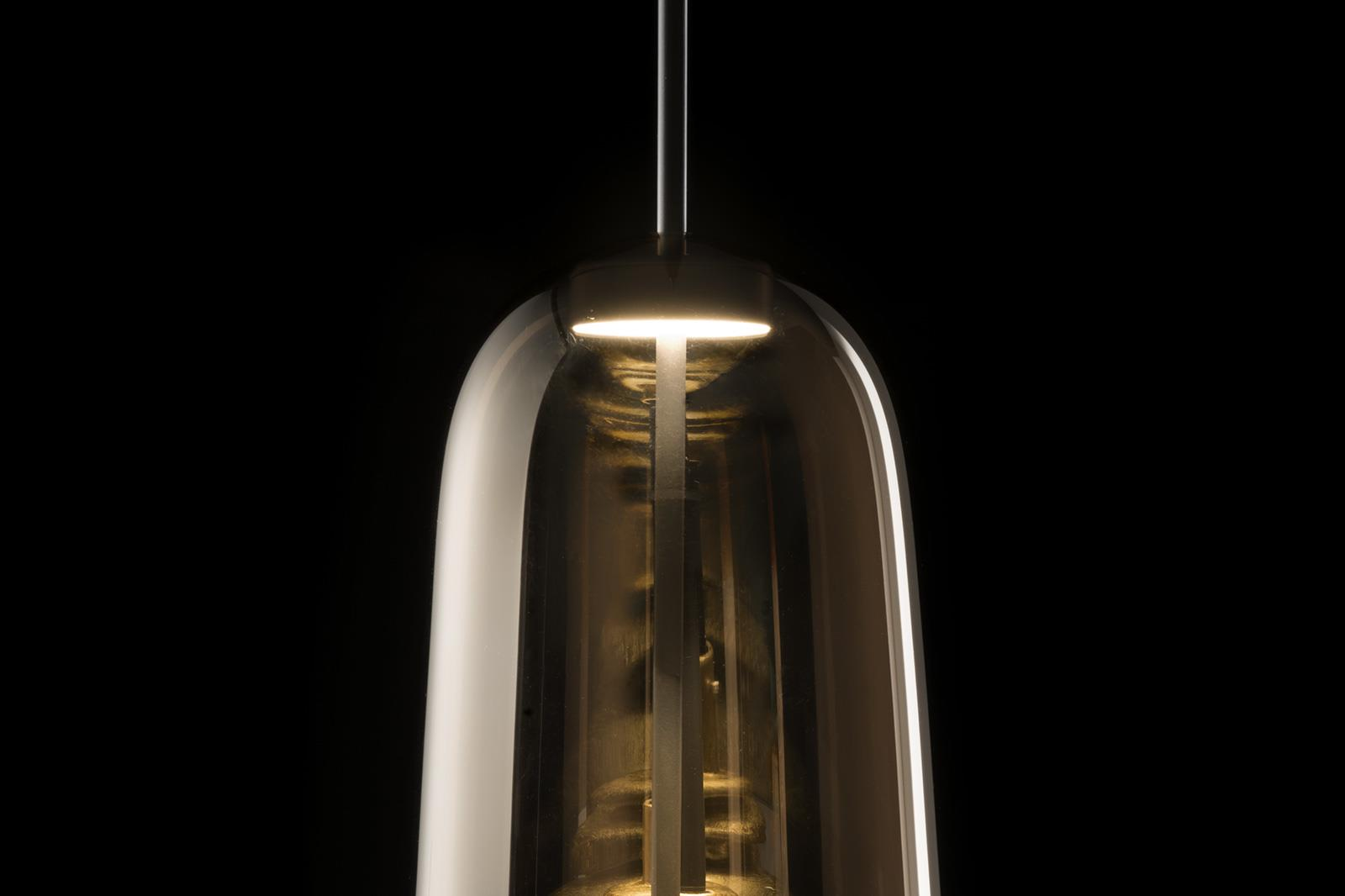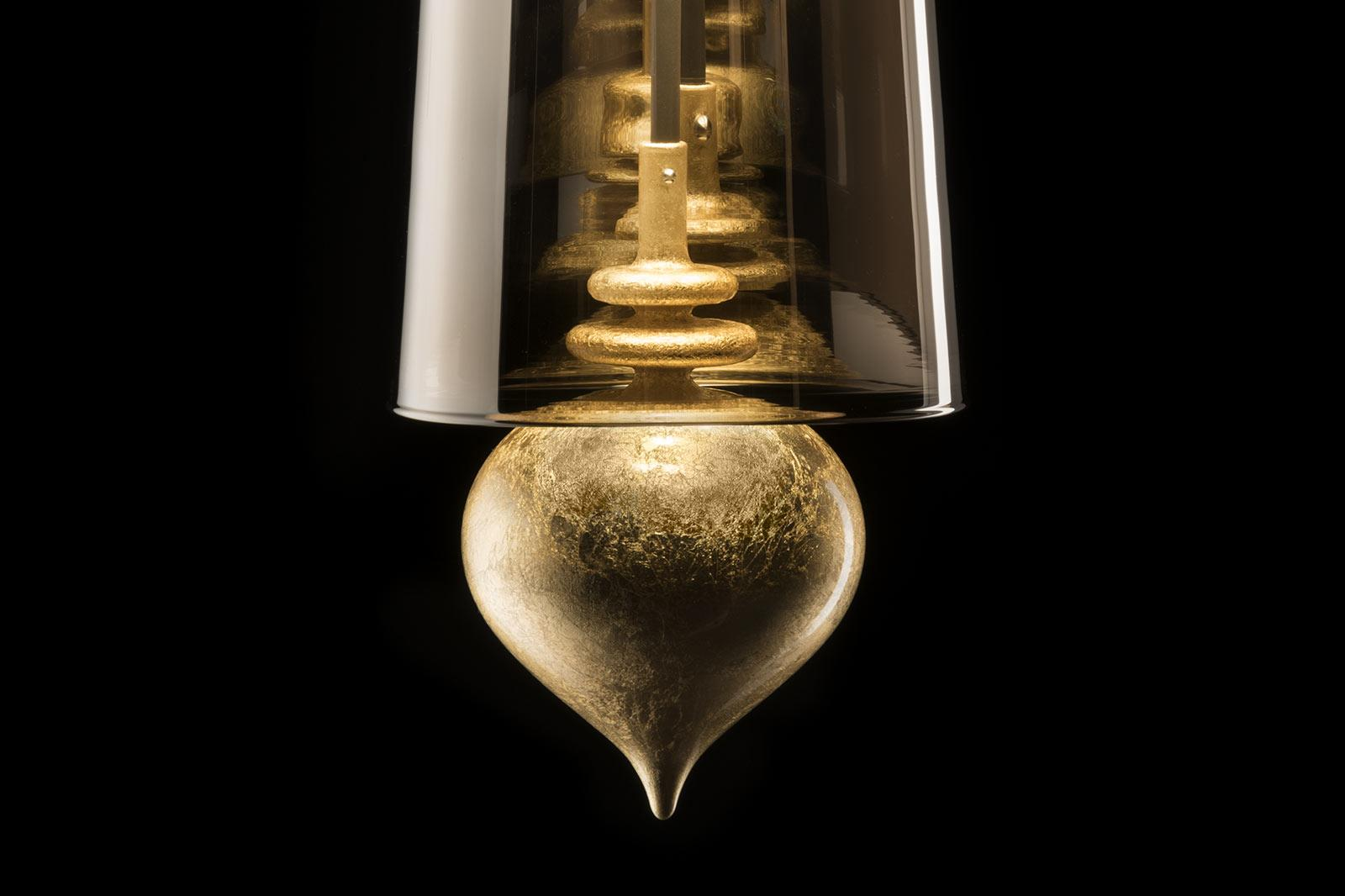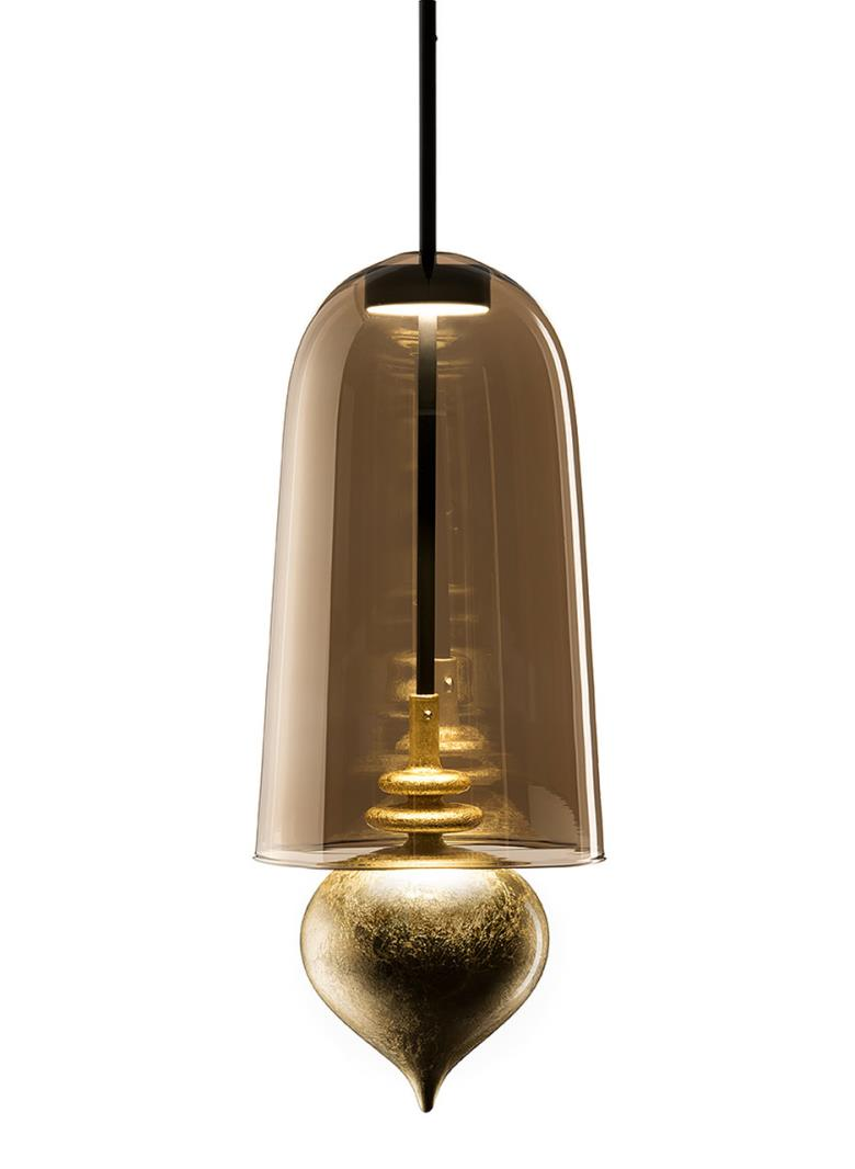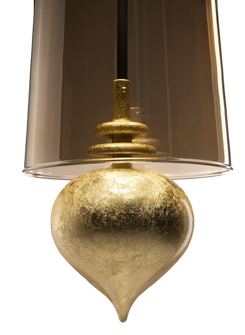 Suspension lamp. Hand blown titanium metallized glass dome with internal frosted bubble glass sculpture.