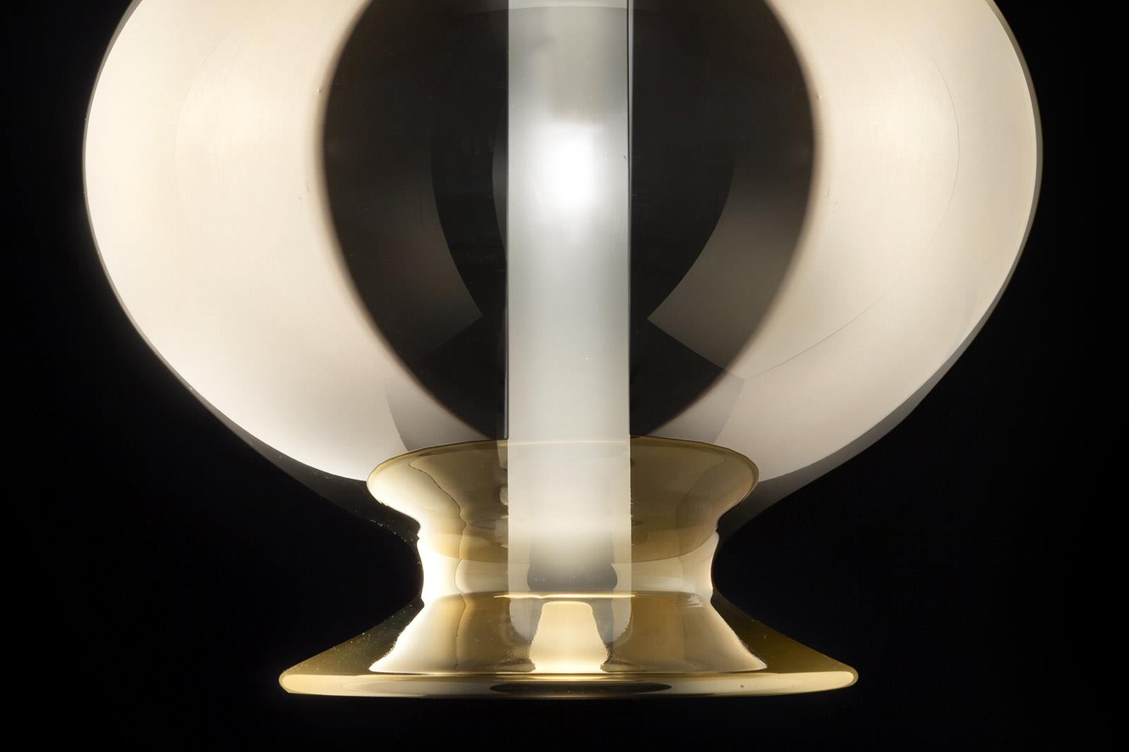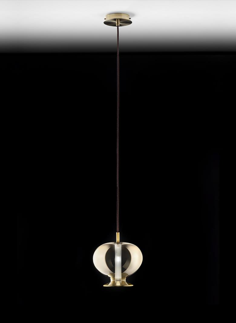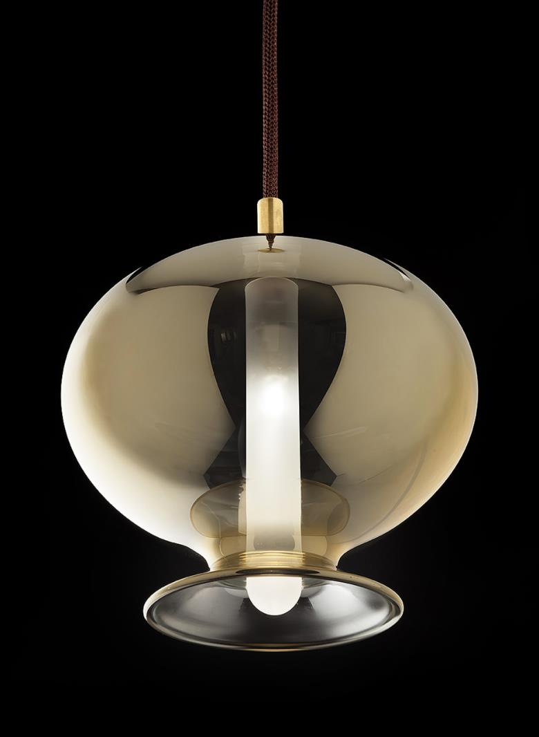 Suspension lamp. Hand blown titanium metallized glass dome with internal frosted bubble glass sculpture.
