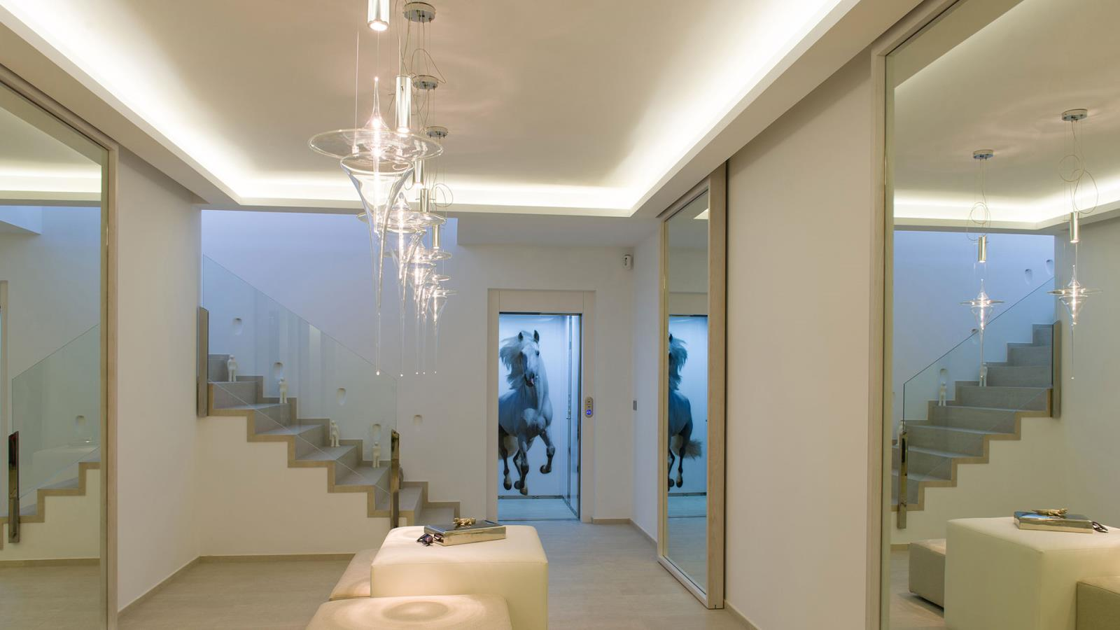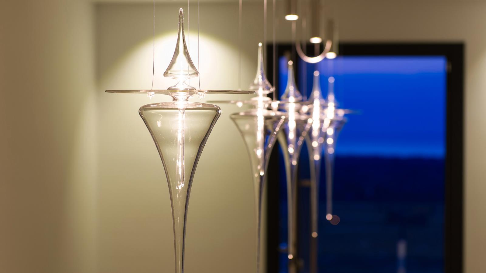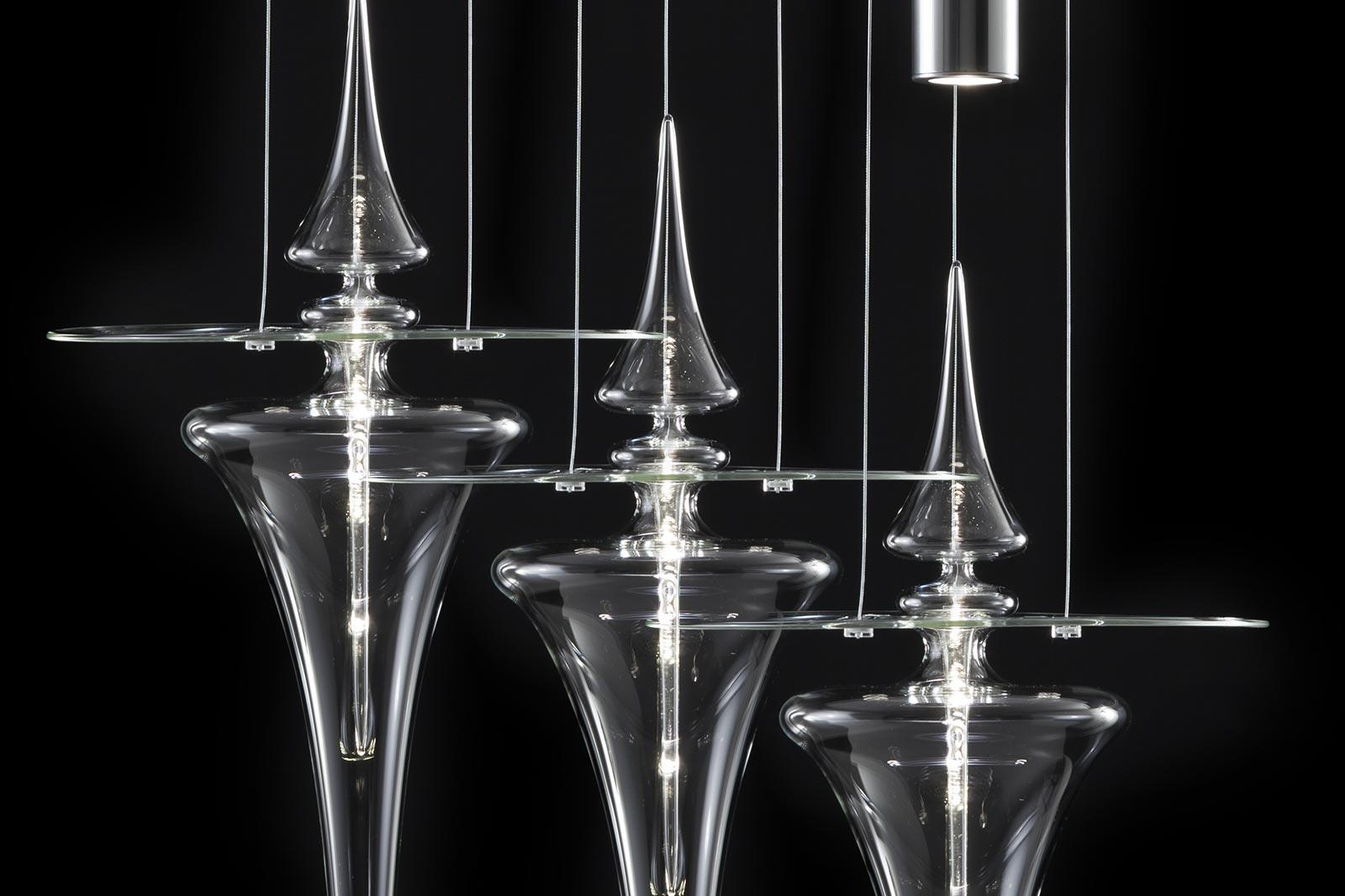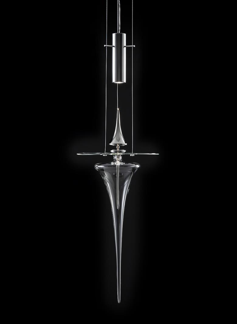 Suspension lamp. Hand blown titanium metallized glass dome with internal frosted bubble glass sculpture.