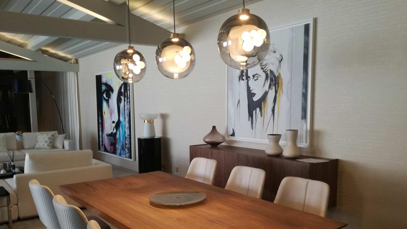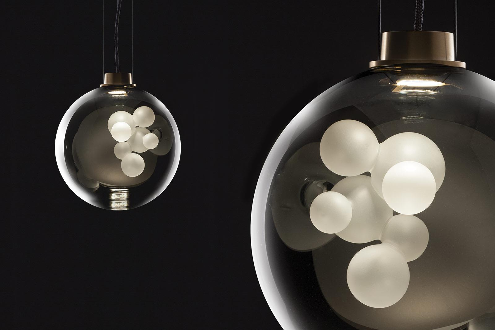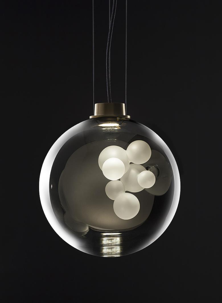 Suspension lamp. Hand blown titanium metallized glass dome with internal frosted bubble glass sculpture.