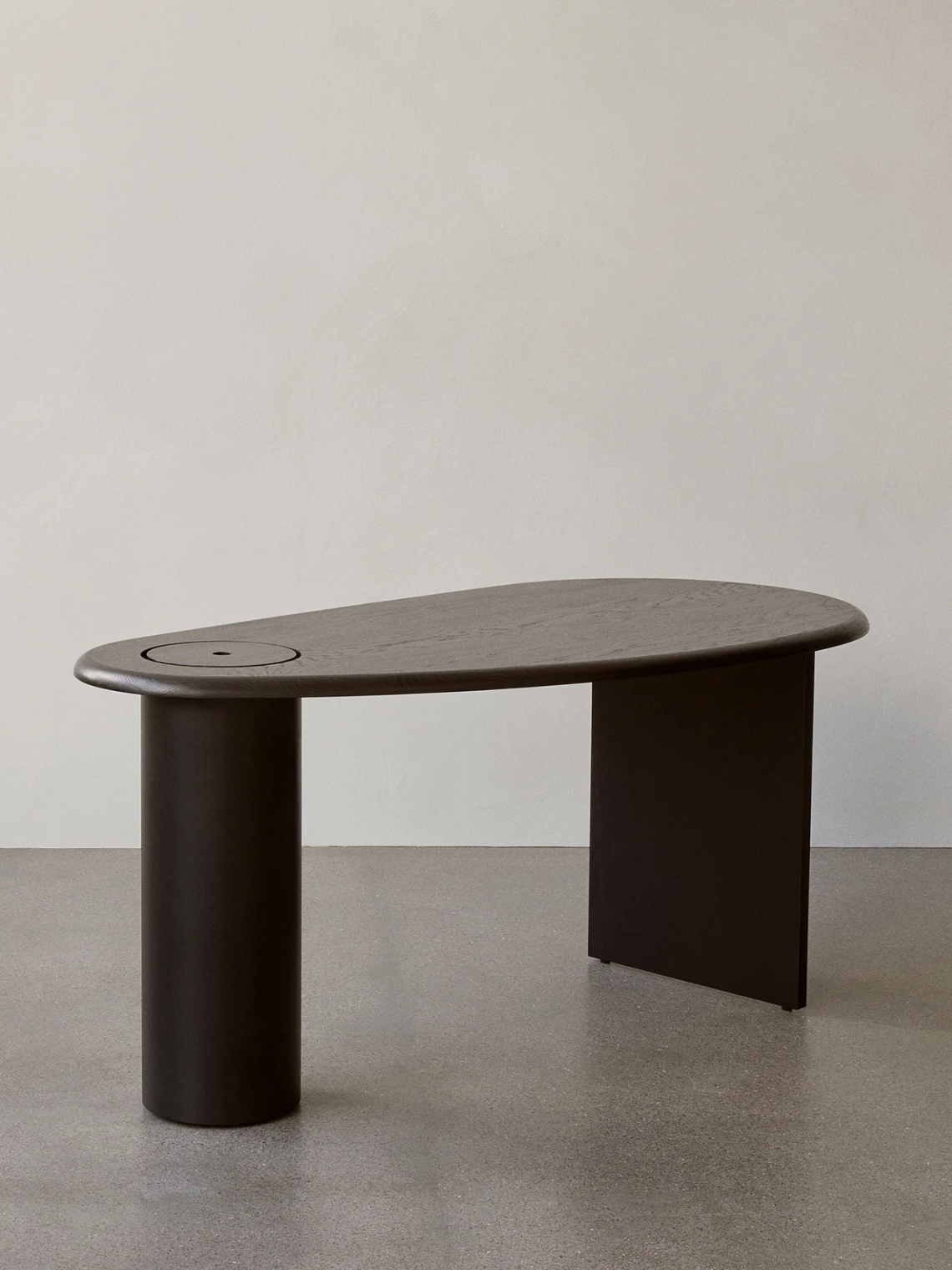 The Eclipse Desk is a celebration of materials and form. Named after its concave and convex form that resembles the illuminated passage of celestial bodies in the sky, the Fred Rigby design has a distinctive, asymmetrical silhouette that invites to touch. Available in solid oak, dark-oiled oak and oiled natural oak with a black painted leg, the tabletop is fitted with a lid that lifts to reveal hidden storage within the supportive steel column, ensuring desk space remains free of clutter. Designed to stand alone as a centrepiece in the middle of a room or for placement up against a wall as a more conventional piece of home office furniture, its intriguing form draws the eye.H: 75 cm, W: 160 cm, D: 80 cm