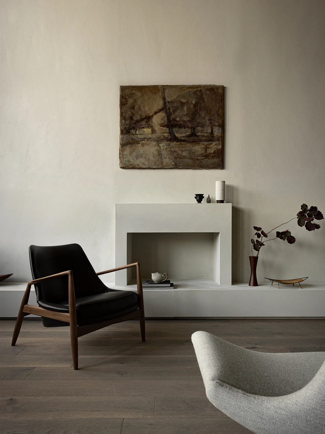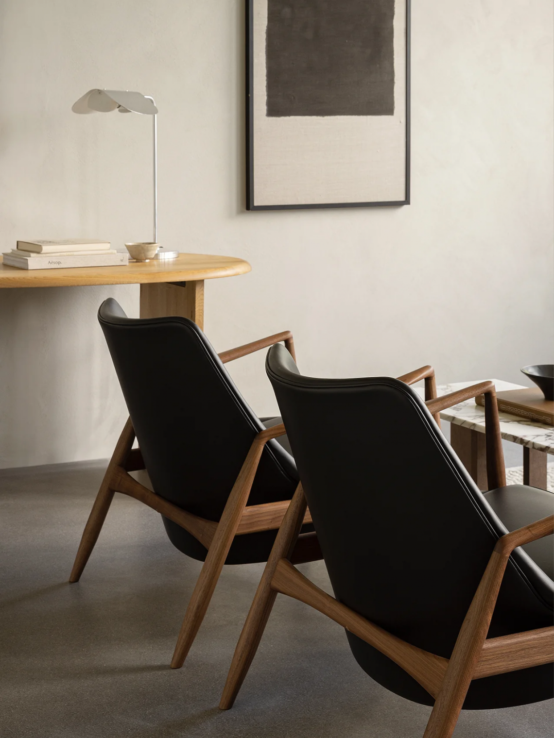 Arguably one of Ib Kofod-Larsen's best-known designs, The Seal is an elegant armchair typical of its time – and yet entirely timeless. The angled frame and armrests and leather upholstery put comfort at the fore, inviting lounging. And despite being made of heavy materials, it has a lightness to it; the shell appears to float inside the wooden frame. Named after the Swedish ski resort, S?len, and not the animal, The Seal is a fine example of Ib Kofod-Larsen's organic design and focus on detail and comfort. The chair is available with a low or high back.
