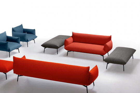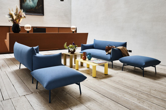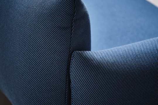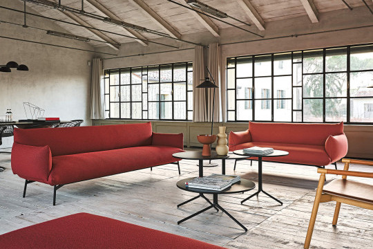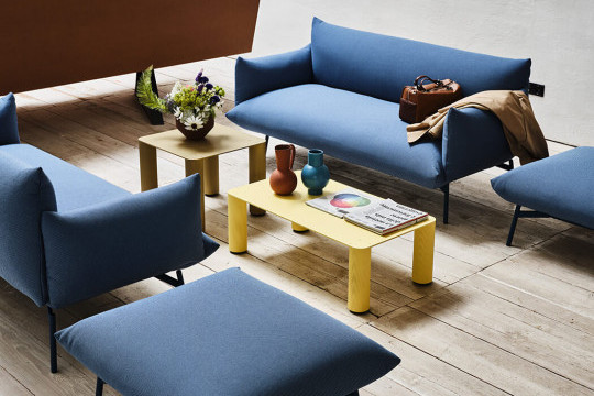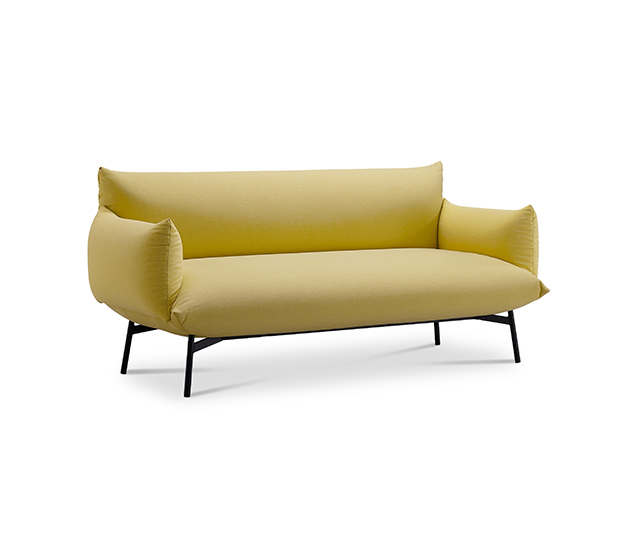 Two-seat sofa with painted metal legs. Seat and backrest upholsteres in