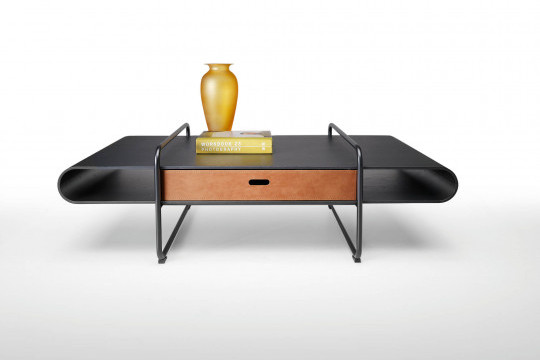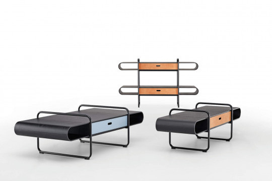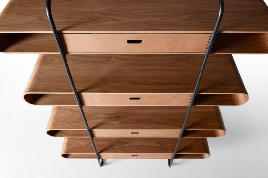Wall bookcase with steel structure. Wooden shelves. Optional: leather