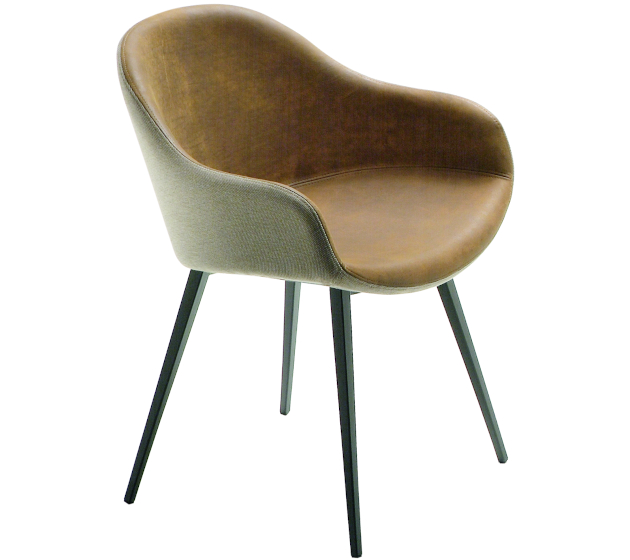 Armchair with four-legs base in steel. Seat upholstered in leather, faux leather or fabric. Possibility of covering front and back with different materials or colors.