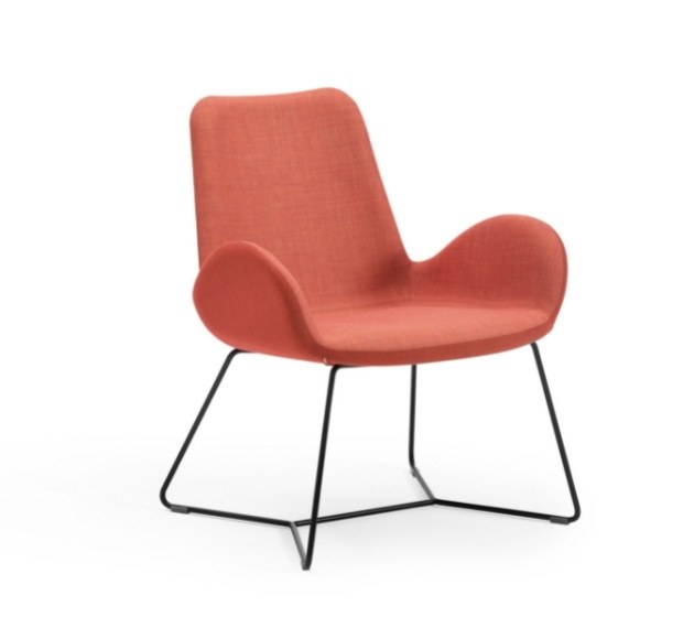 Dalia lounge armchair on restle with metal swivel base. Seating upholstered in fabric, leather or faux leather.