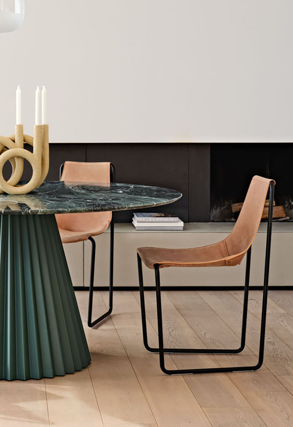 Apelle chair with sled base in lacquered steel. Seat and backrest in hide or tuscan hide.