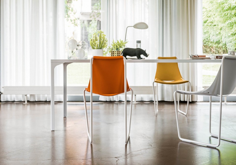 Apelle collection is composed of different versions: chair, armchair, lounge, chaise longue and stool. To complete the collection: desk, sideboard, bookcase, coffee tables and coat rack all available in different finishings.