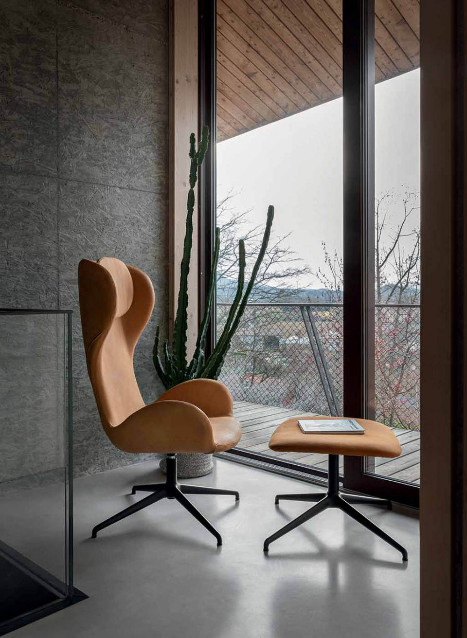 Dalia lounge armchair with high backrest and metal swivel trestle base. Seating is available upholstered in leather, faux leather and fabric. Back and front of backest customizable with different materials and colors.